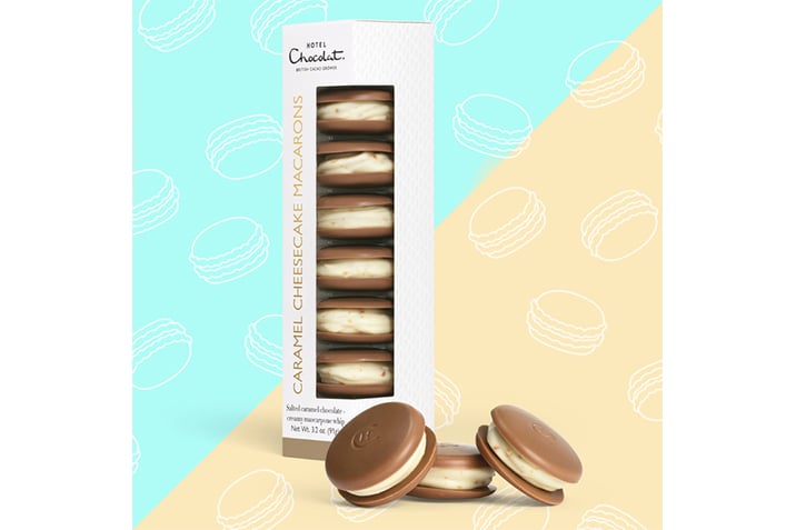 新商品「ソルトキャラメールチーズケーキ マカロン」は、チーズの味をしっかりと感じるマスカルポーネホワイトホイップを、2枚のソルトキャラメルチョコレートのディスクでサンド。チョコレートディスクに加えたエクラ ド キャラメルが、まるでチーズケーキのような新しい食感に。チョコレート×チーズという今までにないコラボレーションが楽しめる。