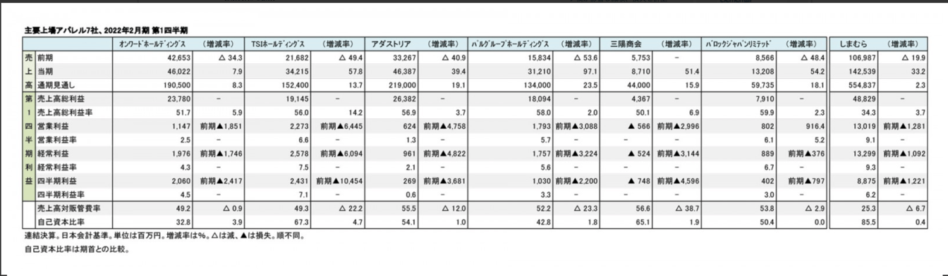 主要上場アパレル企業7社、2022年2月期 第1四半期 決算数値一覧(表1)