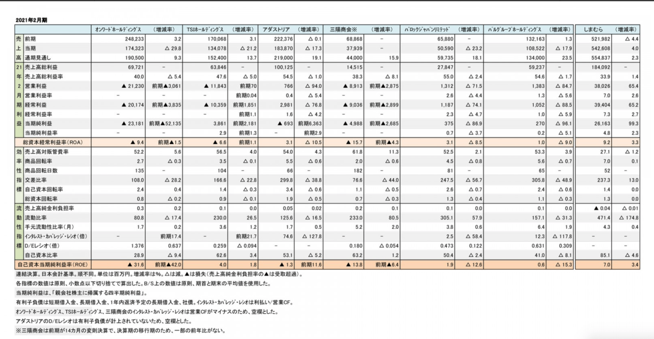 主要上場アパレル企業7社、2021年2月期 連結決算一覧(表2)