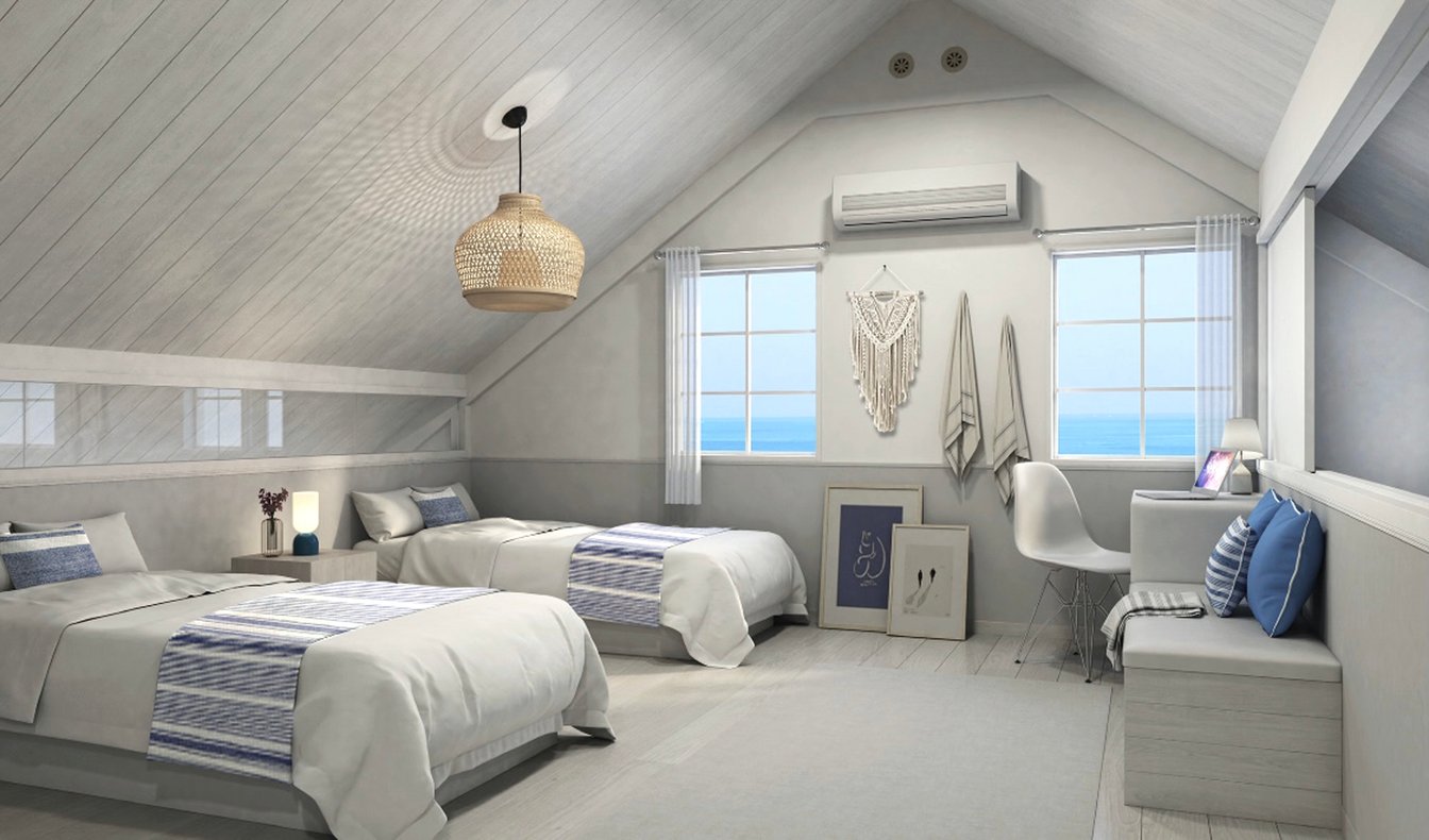 2Fにベッドルームがある一棟貸しタイプ。ホテル直結のビーチ前に位置しているので、美しい海を眺め、波の音を聞きながらゆったりと過ごしてみては。