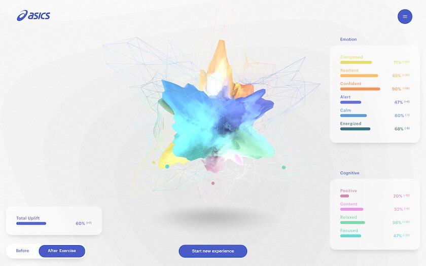まずは「Mind Uplifter」特設サイトにアクセスし、ステップ1で顔認証を行う画面にて自身の顔をスキャンする。そしてステップ2ではストレスや心の状態に関して、科学的根拠に基づいた6つの質問に回答する。ステップ3ではランニング、スイミング、野球、ヨガなど指定された20種類のスポーツから1つを選択し、20分程度の運動を行う。ステップ4ではステップ1、2の顔認証と回答を再び行う。これにより、運動の前と後における脳と感情の状態が測定され、精神状態の変化を判定することが可能になるという。結果は10項目ごとに測定されそれぞれカラーパレットで表示される。所要時間はトレーニング時間含め25分程度で終了した。筆者は20分の筋トレを選択し、実際に測定結果を見てみるとトレーニング前と後では大きな違いがあった。