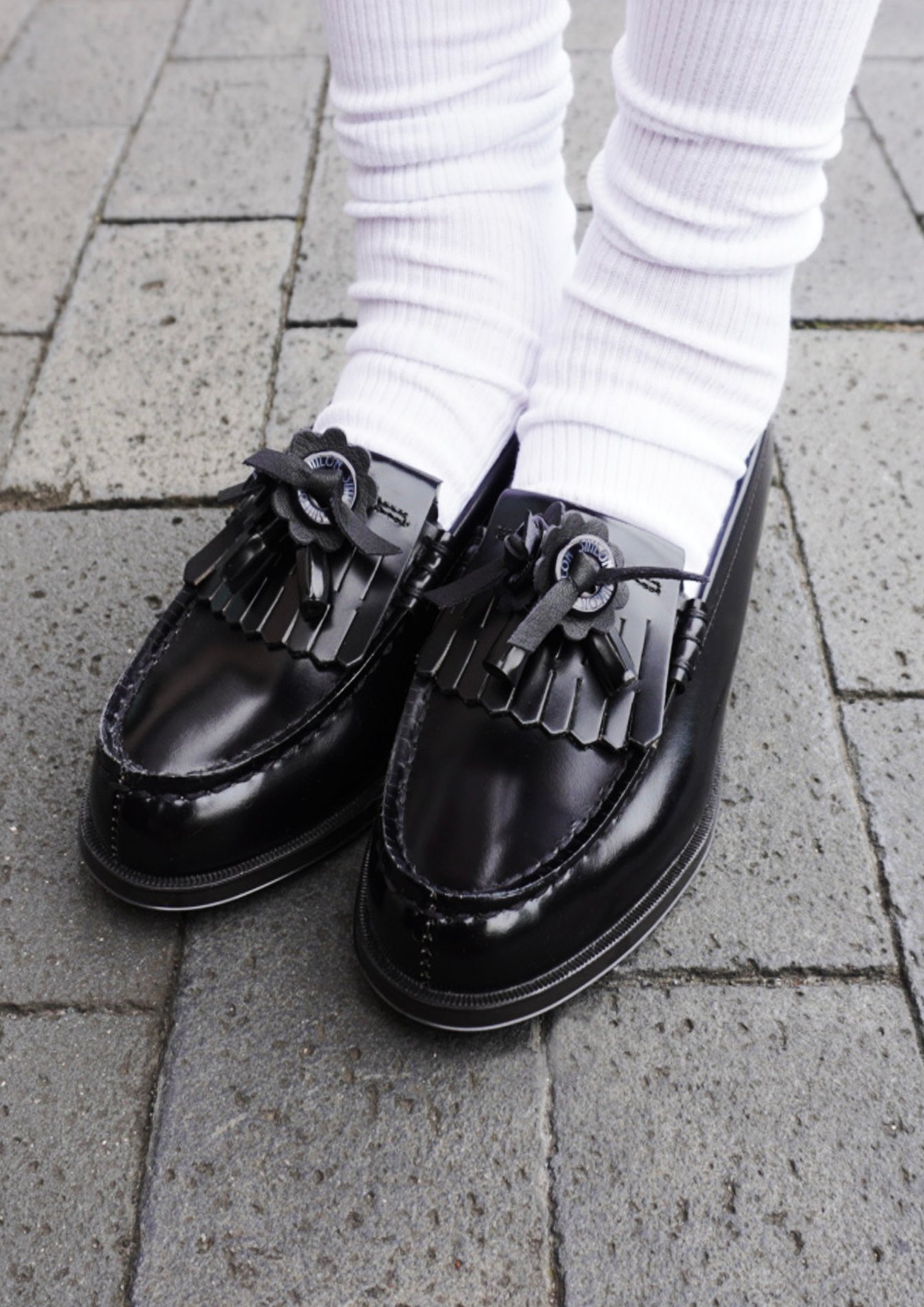 アッパー素材は、コラボ第1弾と同じく光沢性のあるレザーを使用。カラーはブラックで、価格は各2万円(税別)。サイズは21.5cm〜26cmまでそろう。