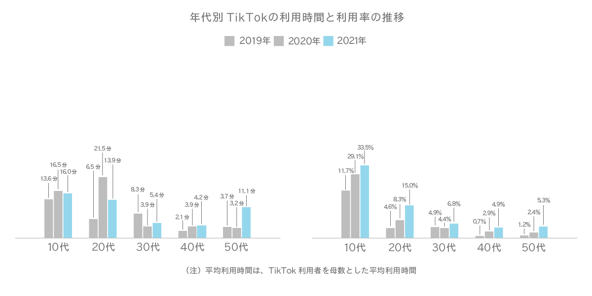 さらに興味深いことに、性別で見ると女性のSNS利用率が全年代で上昇しています。利用時間は昨年から引き続きSNSが増加傾向で「67.1分」(2020年)から「77.8分」(2021年)と2020年から15.9%増加し、3分類の中でも最も長かったといいます。