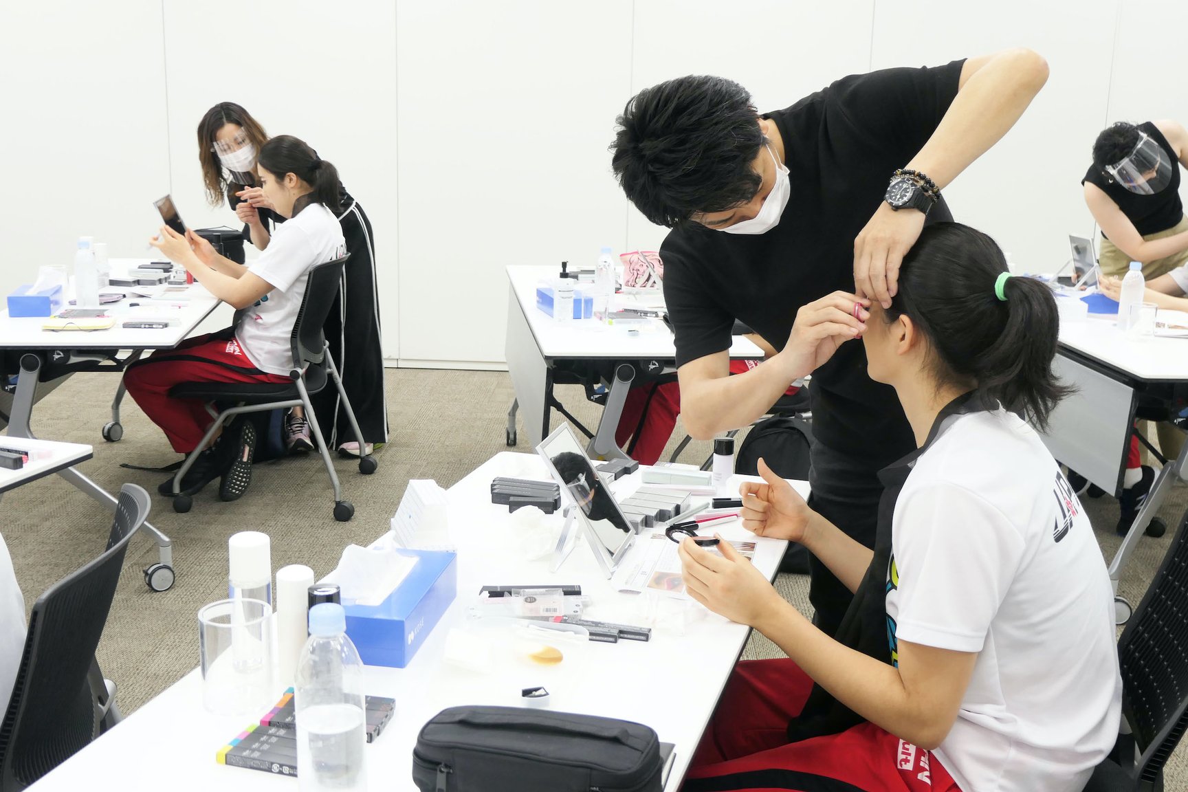 コーセーではオフィシャルスポンサー契約を締結して以来、定期的にメイク講習会を開催し、演目に相応しいメイク表現や、水中の激しい演技でも崩れることのないメイクテクニックなどを指導することで、選手が安心して演技に集中できるようサポート。衣装や楽曲に合わせた世界観をメイクでも表現できるようメイクデザイン考案、選手自身で大会用のメイクができるようにするための指導、日々のスキンケアのアドバイスなどを行っている。