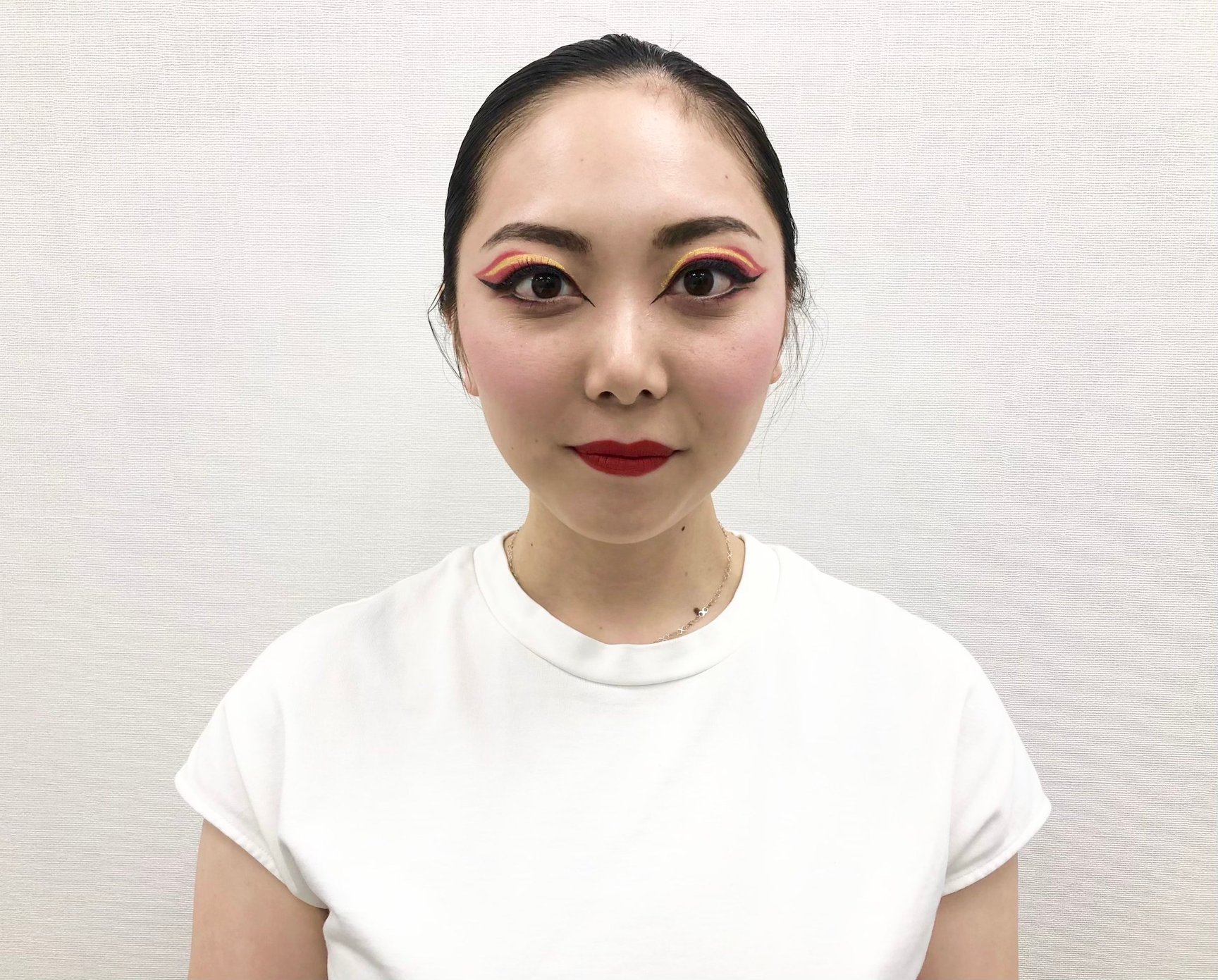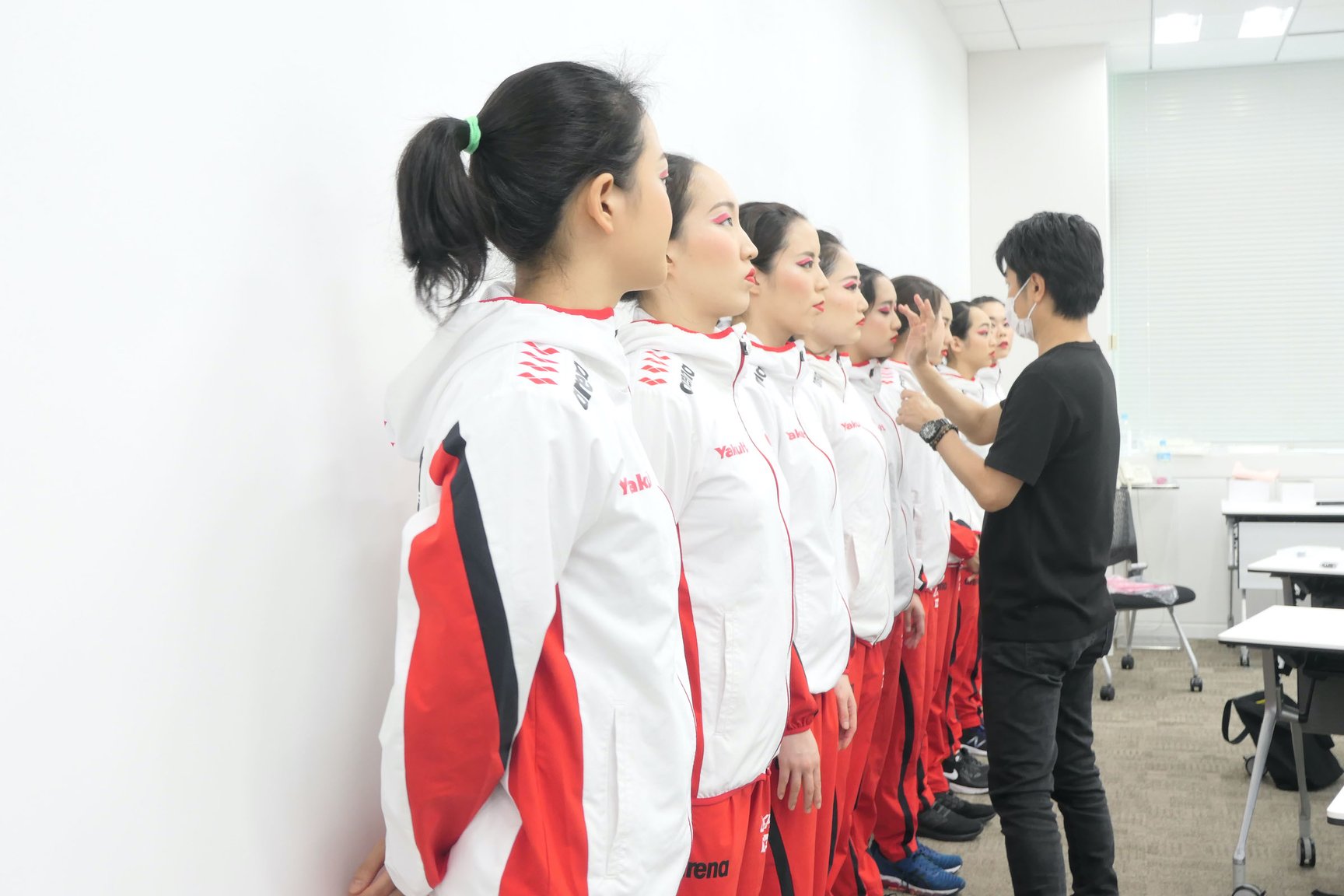 大会のメイクは選手自身の手で仕上げるため、今年6月にはメイク講習会を開催した。選手自身の手でメイクを施した後、選手が一列に並び、審査員席からの距離を想定した位置から全員が同じような顔立ちに見えるかどうかを井村雅代ヘッドコーチと石井で確認。実際の水着の色とのバランスや見え方と照らし合わせながら、選手の個々の顔立ちや肌の色に応じて、眉の形・アイラインの太さ、長さなどを個別に調整し、細かい色味やニュアンスを改良したという。