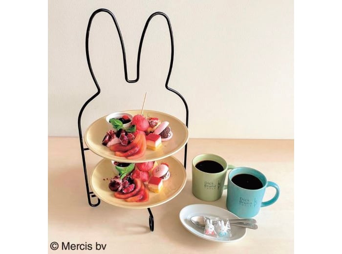 「ディック・ブルーナテーブル」では、ミッフィーを模した「チーズケーキバー」や「DBT特製花束サラダ」、さらには「アフタヌーンデザートセット」(上から6番目の画像)も人気。こちらも「猫部パーラー」と同様に、オリジナルのミッフィーフレームにスイーツを盛り合わせたもので、大人が楽しめるワインバージョンも用意した。