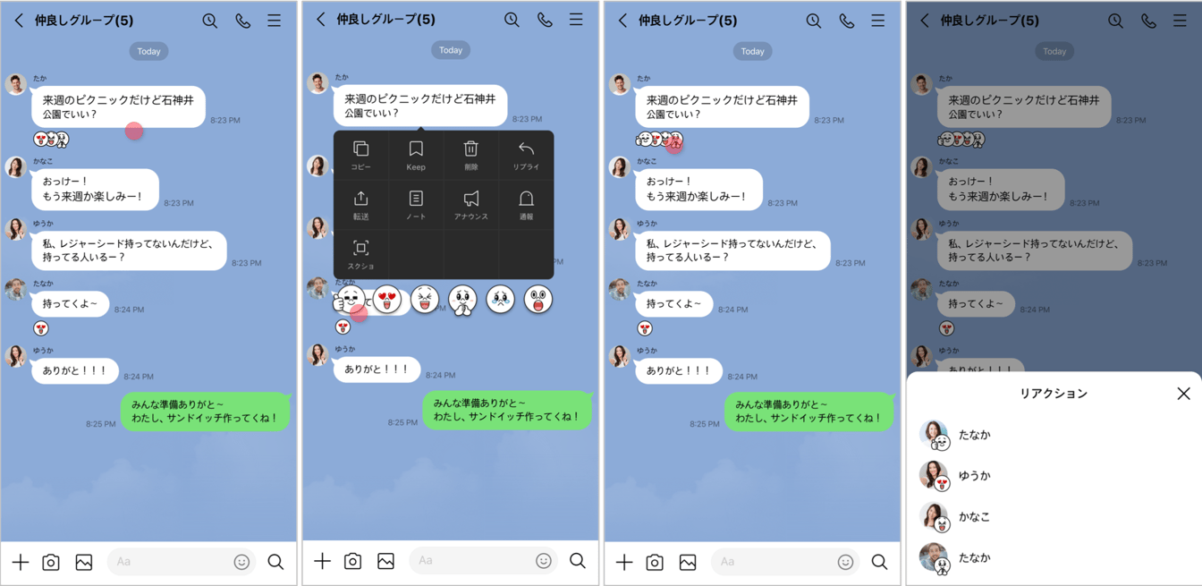 グループラインなどで会話が進んで過去のメッセージに反応するタイミングを失ったときや、スタンプだけで何度も返信するのに気が引けるといったときなどにそっとリアクションできる便利な機能といえるでしょう。もちろん、個人間のトーク上でも使用可能です。