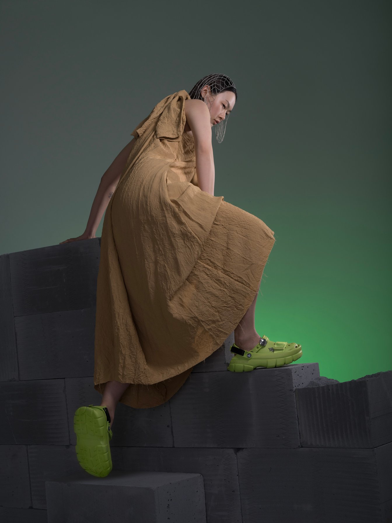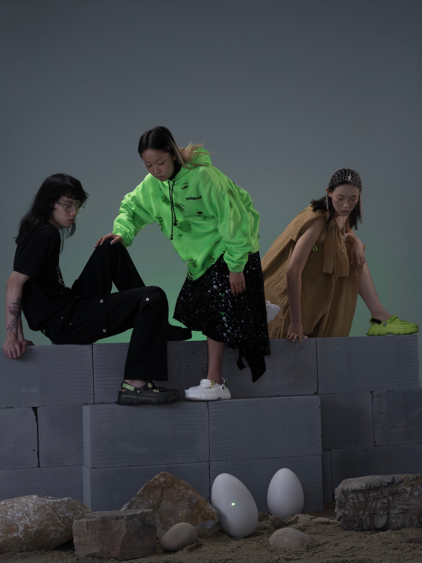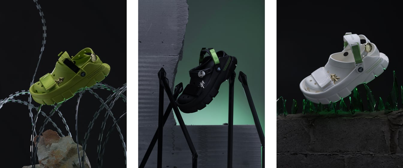 『Crocs x SANKUANZ』コレクションには、そんなSANKUANZ独特の視点を取り入れた、実験的ともいうべき斬新な3つのスタイルがお目見えします。
