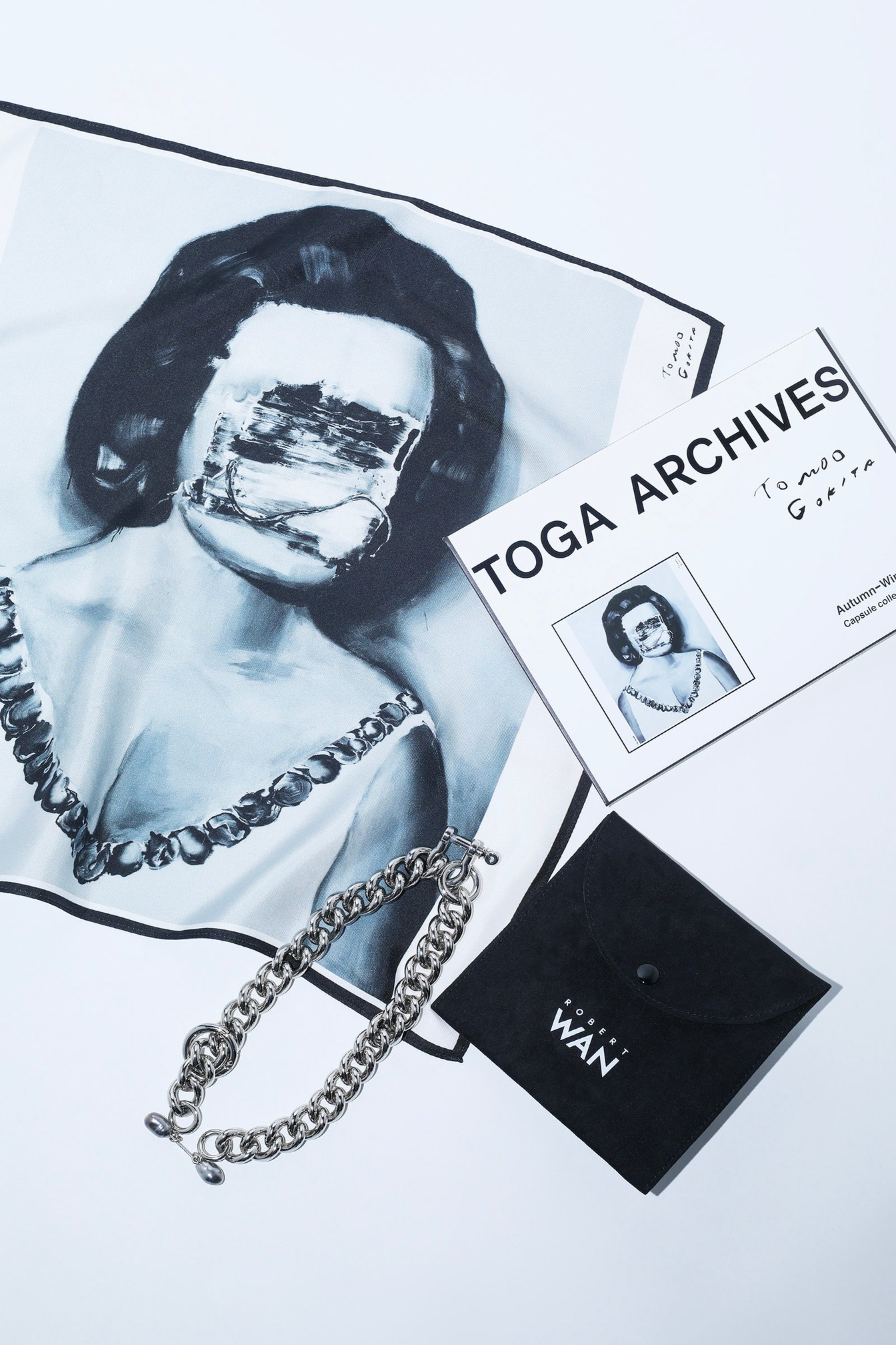 このほか、「トーガ」とジュエリーブランド「ロバート ワン(ROBERTWAN)」がコラボレーションしたパールバーヘッド付きのネックレスは、9月10日に発売。力強いチェーンと繊細なパールが融合したアンバランスなデザインで、「TOGA × Tomoo Gokita」のスカーフとセットで販売される。