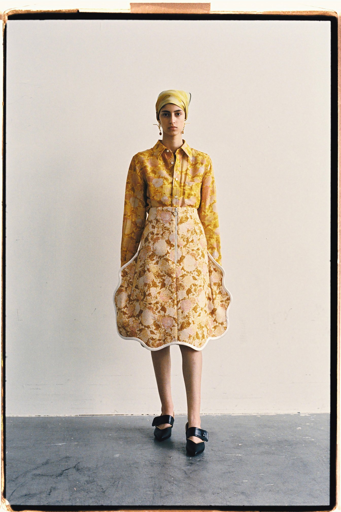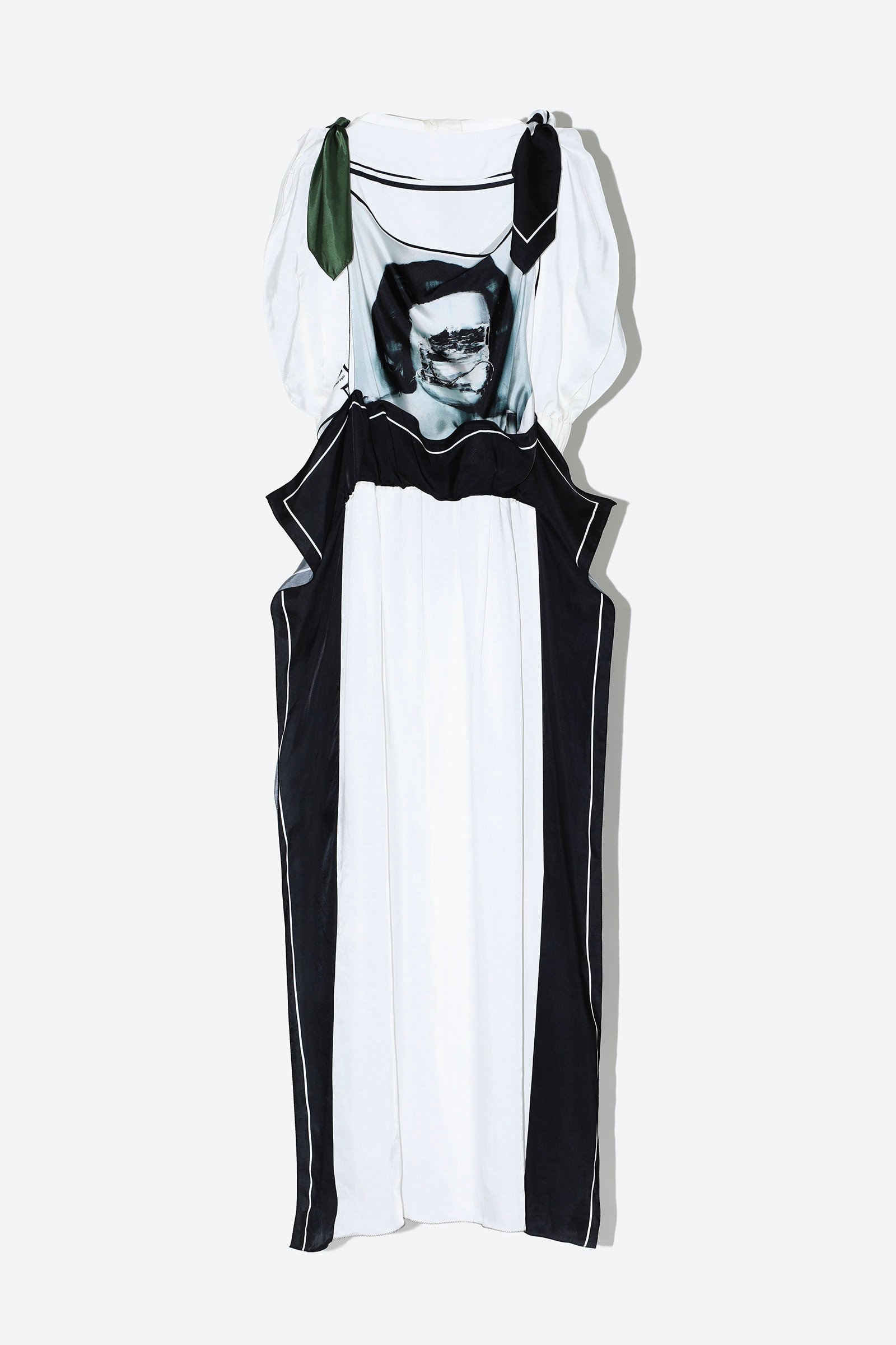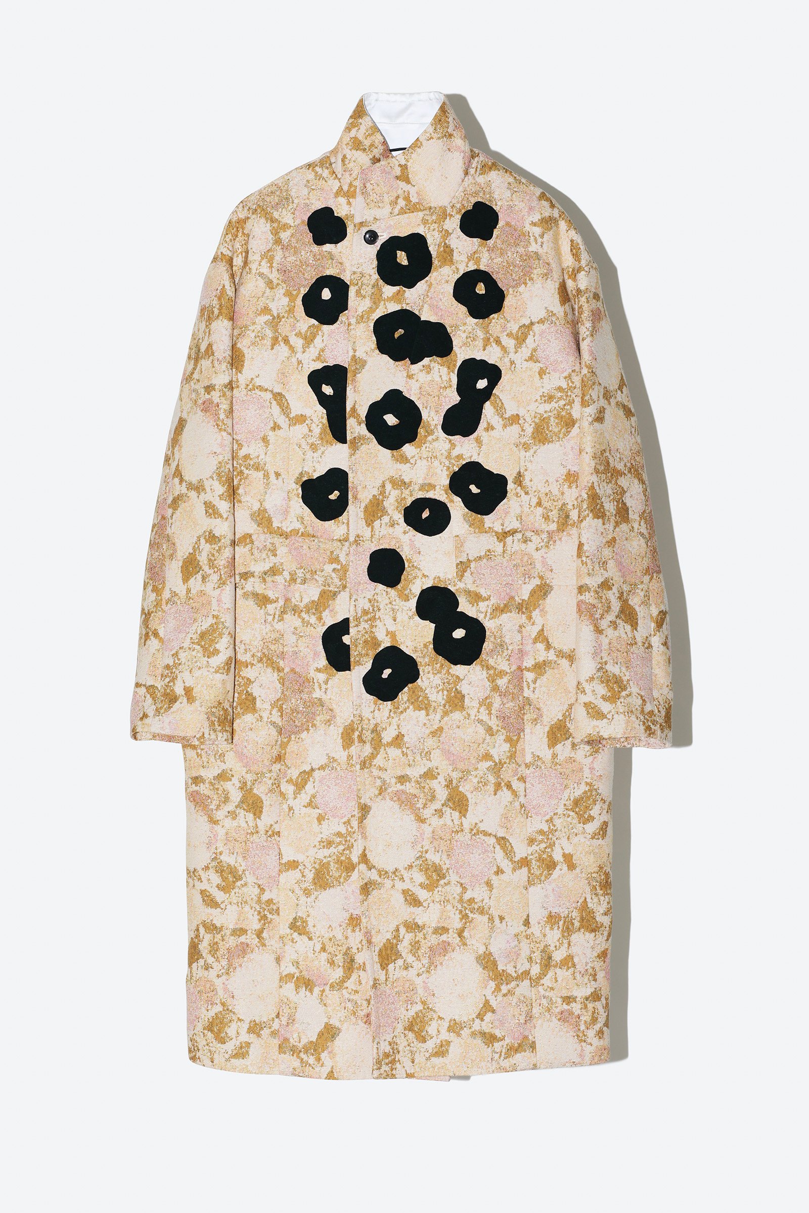 「TOGA × Tomoo Gokita(トーガ × トモオ ゴキタ)」と名付けたカプセルコレクションは、「トーガ」の2021年秋冬コレクションで発表。五木田の作品を大胆にあしらったゴブランジャカードのコート(17万6000円)をはじめ、ポンチョコート(12万1000円)、シルクレーヨンのプリントドレス(9万7900円)、胸元に猫がプリントされたTシャツ(2万9700円)、スカーフ(1万8700円)、猫や花モチーフのポーチ(1万9800円)などがそろう。