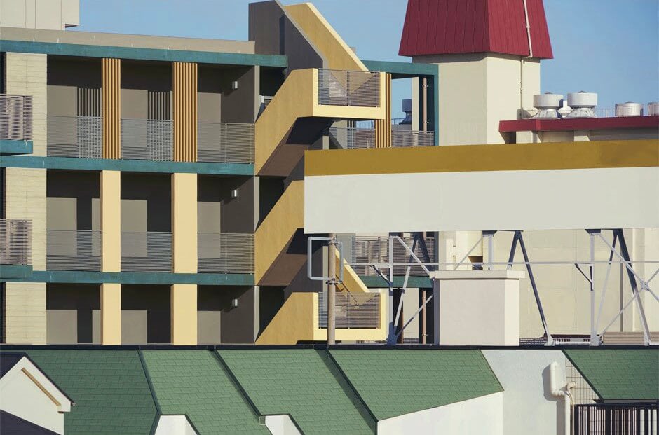 広告看板の文字やビルの窓、室外機、アンテナなど、人間が生活することで装飾された「ノイズ」となるような視覚情報をできるだけ除去し、さらに色彩や配色を変えて雲や建築物までも合成することで虚構の風景が生み出された今作。
