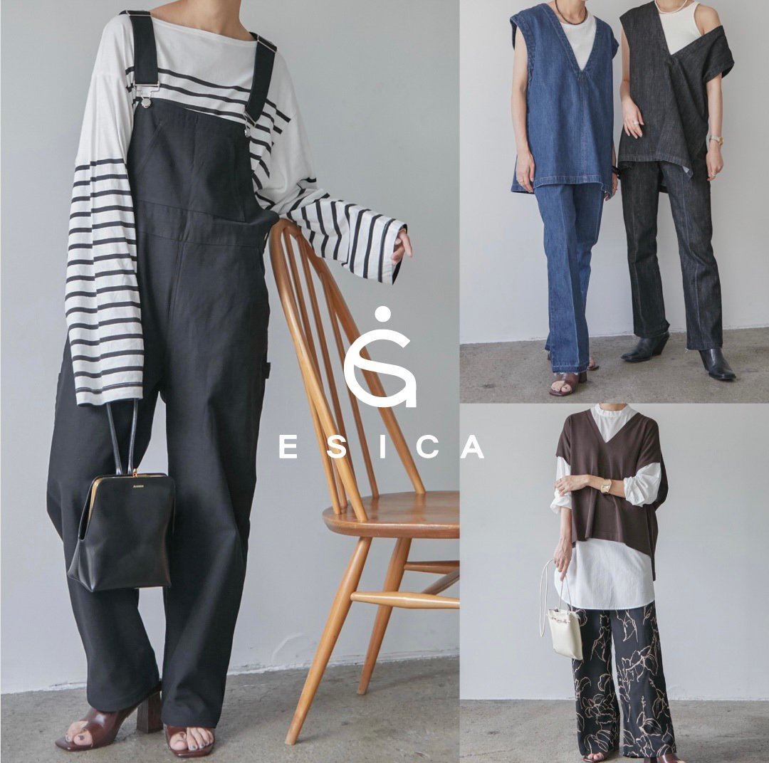 影山:「ESICA(エシカ)」という20代後半~40代まで幅広い層の女性に向けた、ワンマイルウェアとしての要素もありながら外でも着られる、シンプルなライフスタイルに取り入れやすいブランドです。このブランド最大の特徴は、“全身コーディネートのセット販売”をするというところで、例えばシャツワンピースとボトムスのセットやカットソーとスカートのセットなど、全身コーデで購入できるんです。今、お洋服が好きでもコーディネートに悩む方という方は多く、そんなときに「ESICA」の服ならコーディネートのセットそのままでもいいし、手持ちのもの単品で組み合わせてもいい。1セットあれば一気にコーディネートが広がります。1つのアイテムをベースに3.4種類のコーディネートを展開するので、購入した商品がほかにどのようなコーディネートができるかというアイデアも得られます。