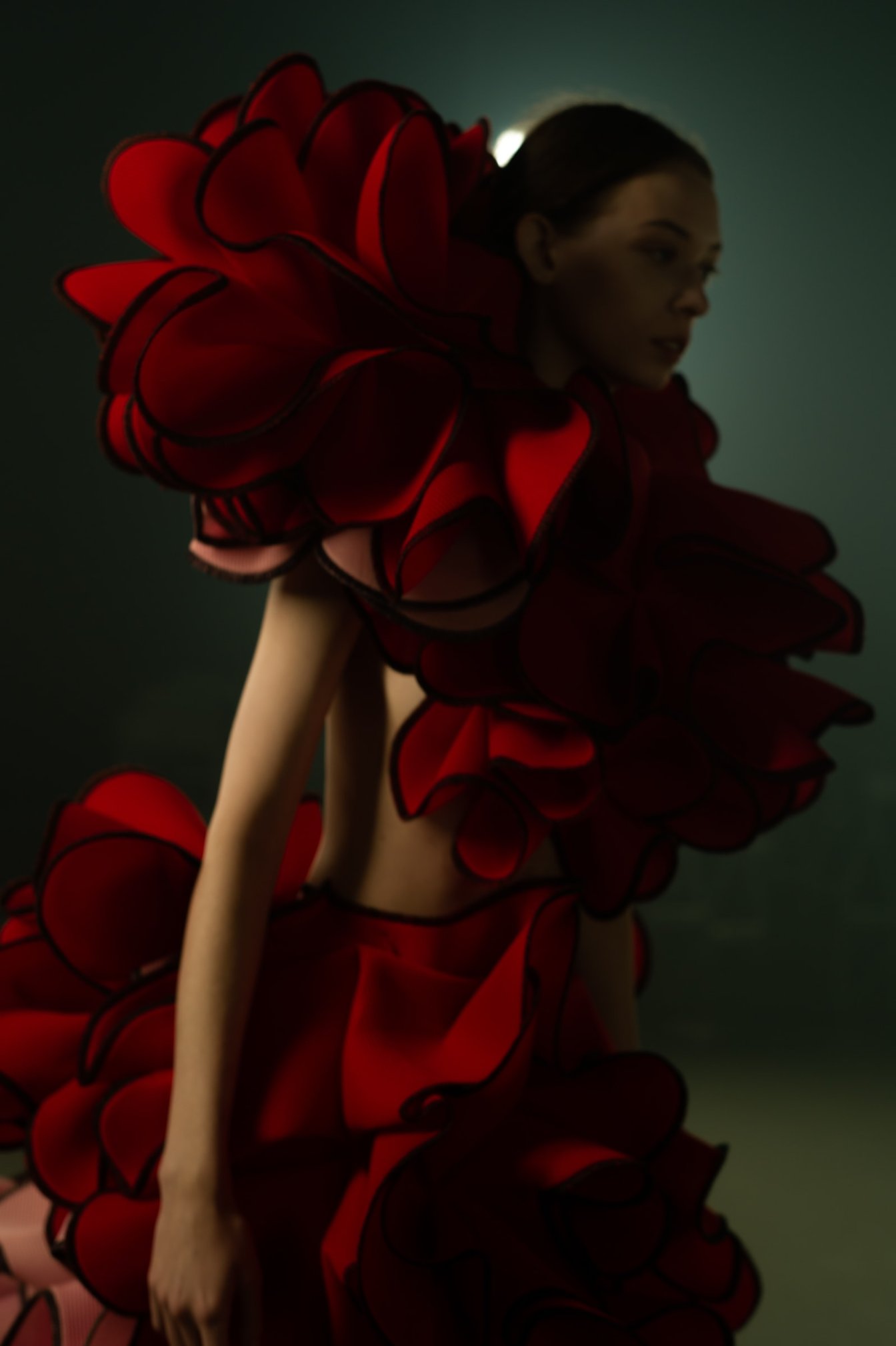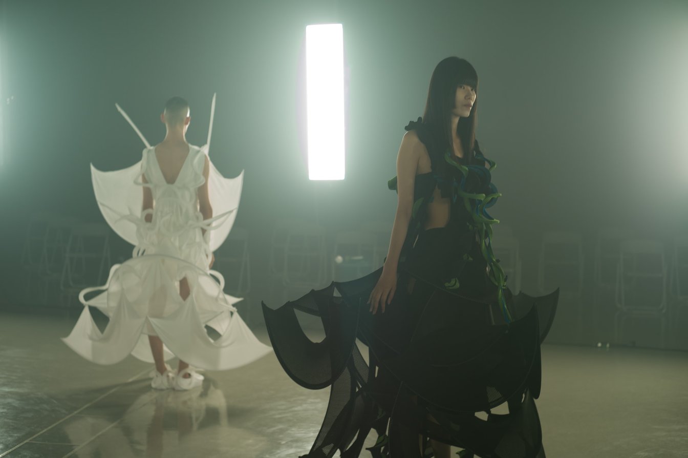 今回の岡﨑のドレスが偶さかにオートクチュール的なフォルムに映ってはいても、クチュール的な過程や景色を端より念頭に置いた創作ではない。それとは真逆な、服飾史に於ける異端な手法を以て、恰もオートクチュール的なフォルムを模写している。フォルムは岡﨑の特異な美的感覚と好尚によって篩に掛けられ、模写される対象に彼の野性的な感覚が加わり一層大胆な表現に磨きが掛かる。こうした、思わず超自然的な力の存在を信じてしまうほどに神秘的で美しい詩情は、武骨なユーモア(クチュールの模写)とか、魑魅魍魎の猥雑さと境界を接し、審判を下す者であると同時に、紛れもなく作り手の共犯者でもあるのだ。(文責/麥田俊一)