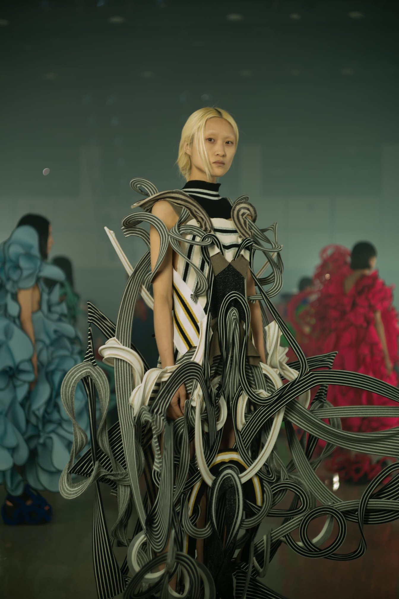 この異端の創作は、底の浅い古着のリメークやコロナ禍に応じた俄な仕立ての自然志向のショーに慣らされ鈍ったこちらの皮膚感覚を一気に覚醒させてくれ、心の奥底に澱んでいたオリを綺麗に洗い流してくれた。私はショー終了後の楽屋に飛び込んだ。この湧き上がる感情を作り手本人に伝えたかった。それに彼と会話をしてみたかった。岡﨑龍之祐は「祈り」「左右対称」「縄文土器」「自然界の循環」と云うキーワードを挙げてくれ、その時点で私の予想は確信に変わった。と云うか、不遜に聞こえるかも知れないが、彼の言葉を聞く前に実は知っていた(身体がわかると云う感覚だろうか)。「リュウノスケオカザキ(RYUNOSUKEOKAZAKI)」のドレスは、服に似せたオブジェクトなのか。そんなことは瑣末なことである。少なくとも私にとっては。作り手の特異な創作行為に完璧に呑み込まれたのだから。取材の俎上にのせる所謂ファッションデザイナーとは、岡崎は現時点ではその質は確かに異なる。寧ろ、未だファッションの部外者に近いかも知れない。だがしかし、気力や勢いを削がれて閉塞状態にある今だからこそ、彼の創作はファッションに於ける真摯な行為と云うことが出来るし、私はその行為に与したいのである。