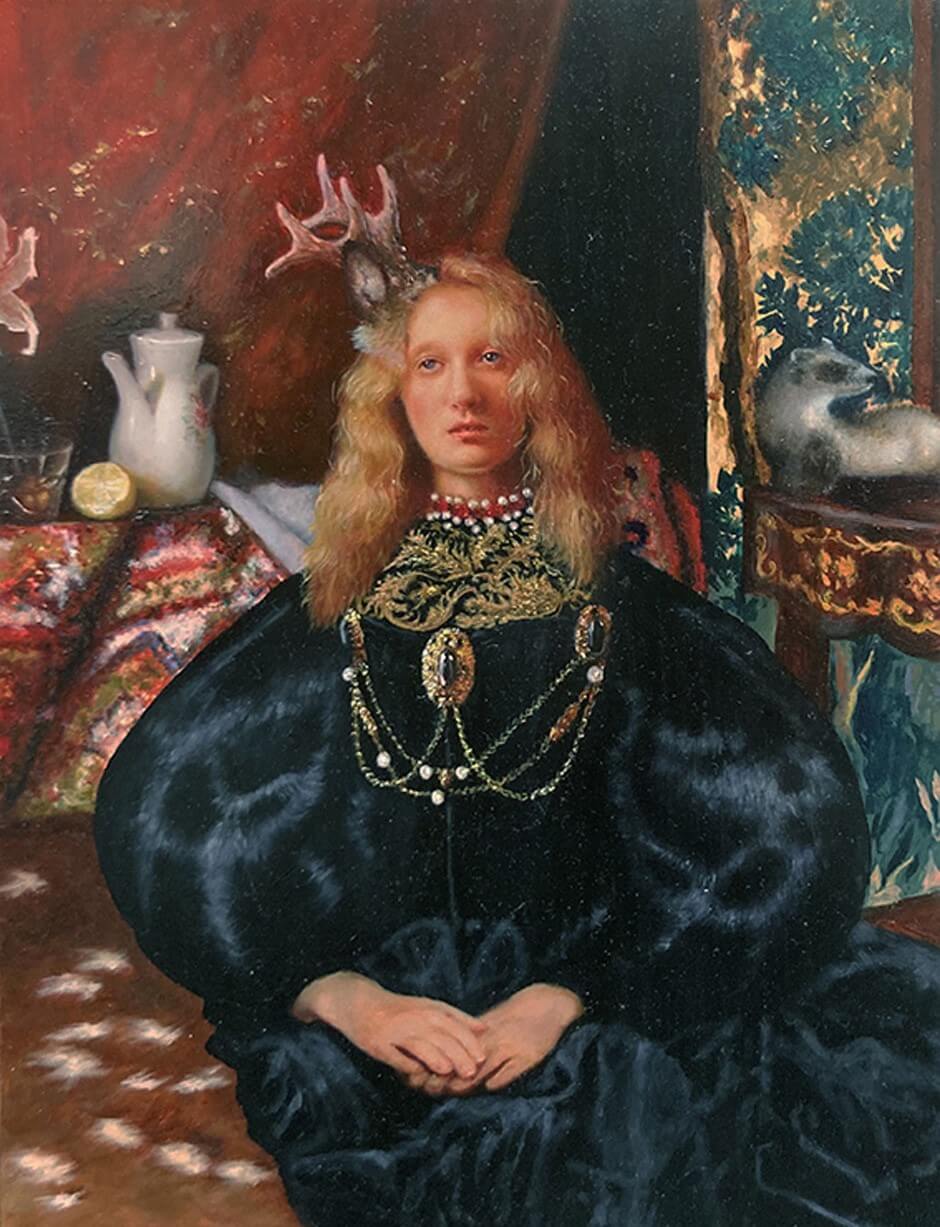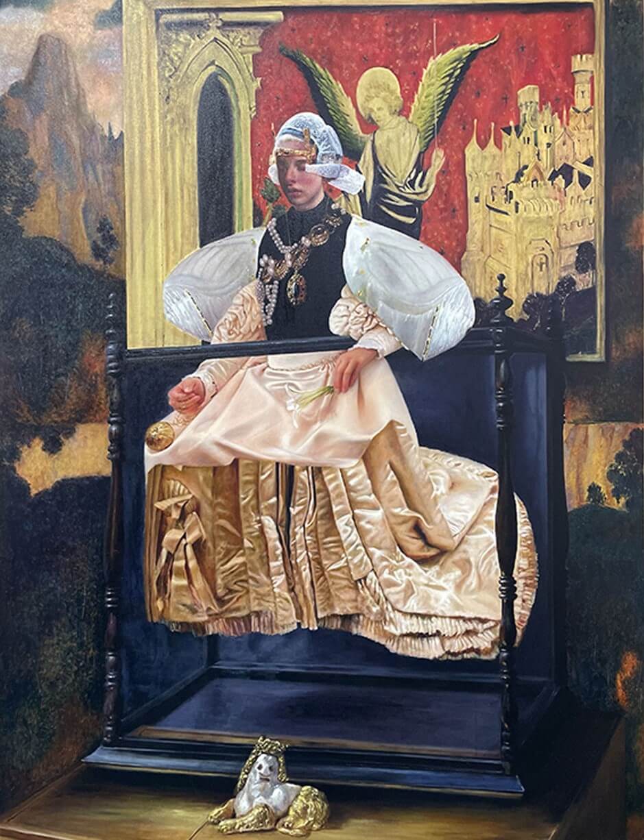 一方で近年は、古典的な肖像画からの引用を用いて歴史や宗教、神話に登場する要素を、デジタルコラージュによって1度再構築したのちキャンバスに描く方法で作品制作を行っている。