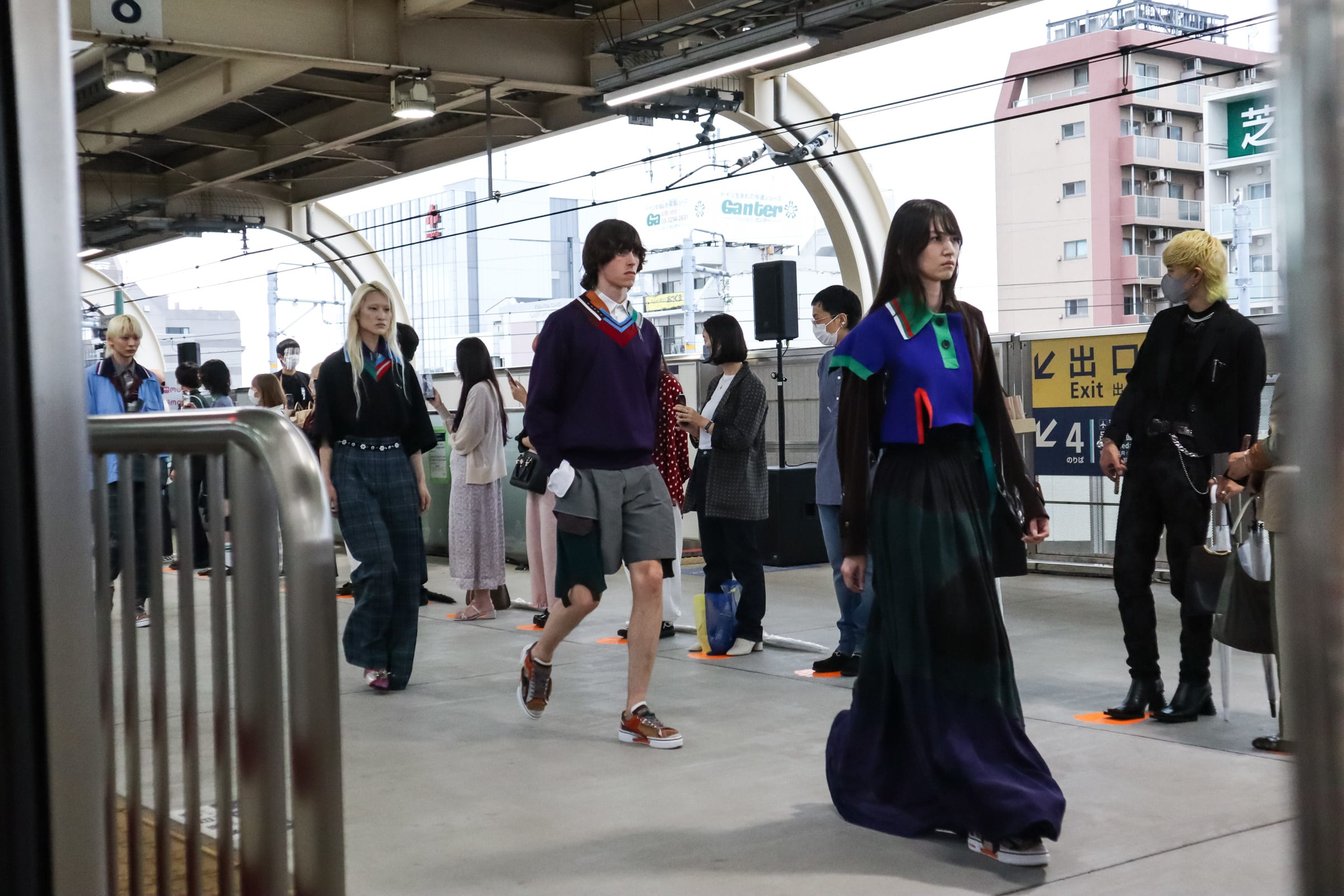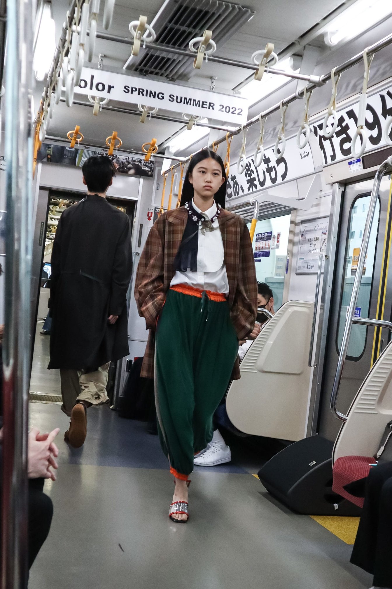 「カラー」の東京でのショー(2022年春夏コレクション)は、楽天「by R」の支援で参加したRakuten Fashion Week TOKYO 2022 S/Sの最終日(9月4日)に発表された。既に各所の報告記事にてその概要は報じられている筈なので、この稿では私が得た小感にとどめておく。ショーのために誂えた貸し切りの4輌列車(京急電鉄デハ1000形)の中は、両隣と間隔を開けた座席指定になっていた。偶さかに私は優先席に振り分けられた。さして混んでいない車中にあって不思議と両隣が開くのが私の常だから慣れたものである。