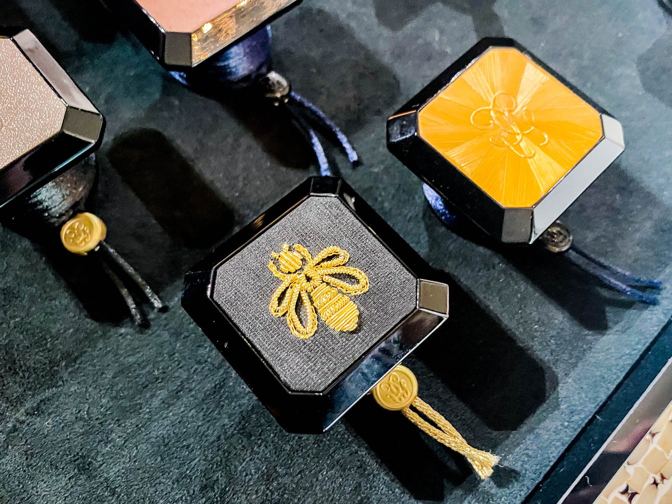 今回、ボトルが一新した。1870年からゲランが受け継いできた「フラコン カレ(四角いボトル)」にインスパイアされ、面取りを施したエレガントな八角形のフォルムに仕上げ、オリジナルのボトルと同様にガラス工房「ポシェ デュ クルヴァル」が製造。ブラックのラベルにはフレグランス名とブランドロゴをゴールドであしらい、ボトル裏側にはメゾンの象徴である蜂のモチーフを刻印した。