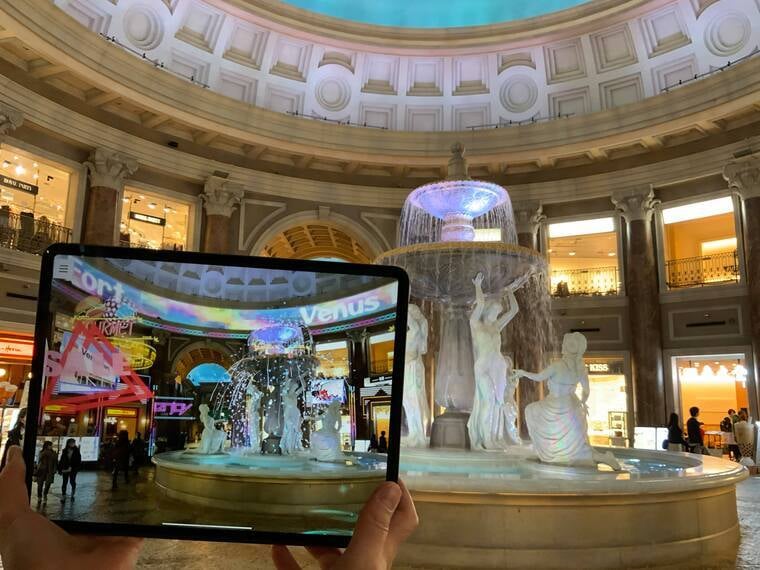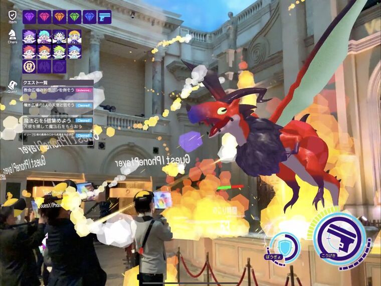 さらに、館内を高精度センサーで読み取り、VR(仮想現実)空間にリアルなヴィーナスフォートを再現し、VR空間でも現実と変わらない買い物体験ができるような取り組みも進めている。また館内を使ったゲームコンテンツも実験。ARとVRを連動させ、館内を移動しながら様々なミッションをクリアしていく。現実世界でもVRから参加している人がARを通してリアルタイムで確認することができ、VR空間にいる人と協力プレーをしながらゲームをクリアすることができる。