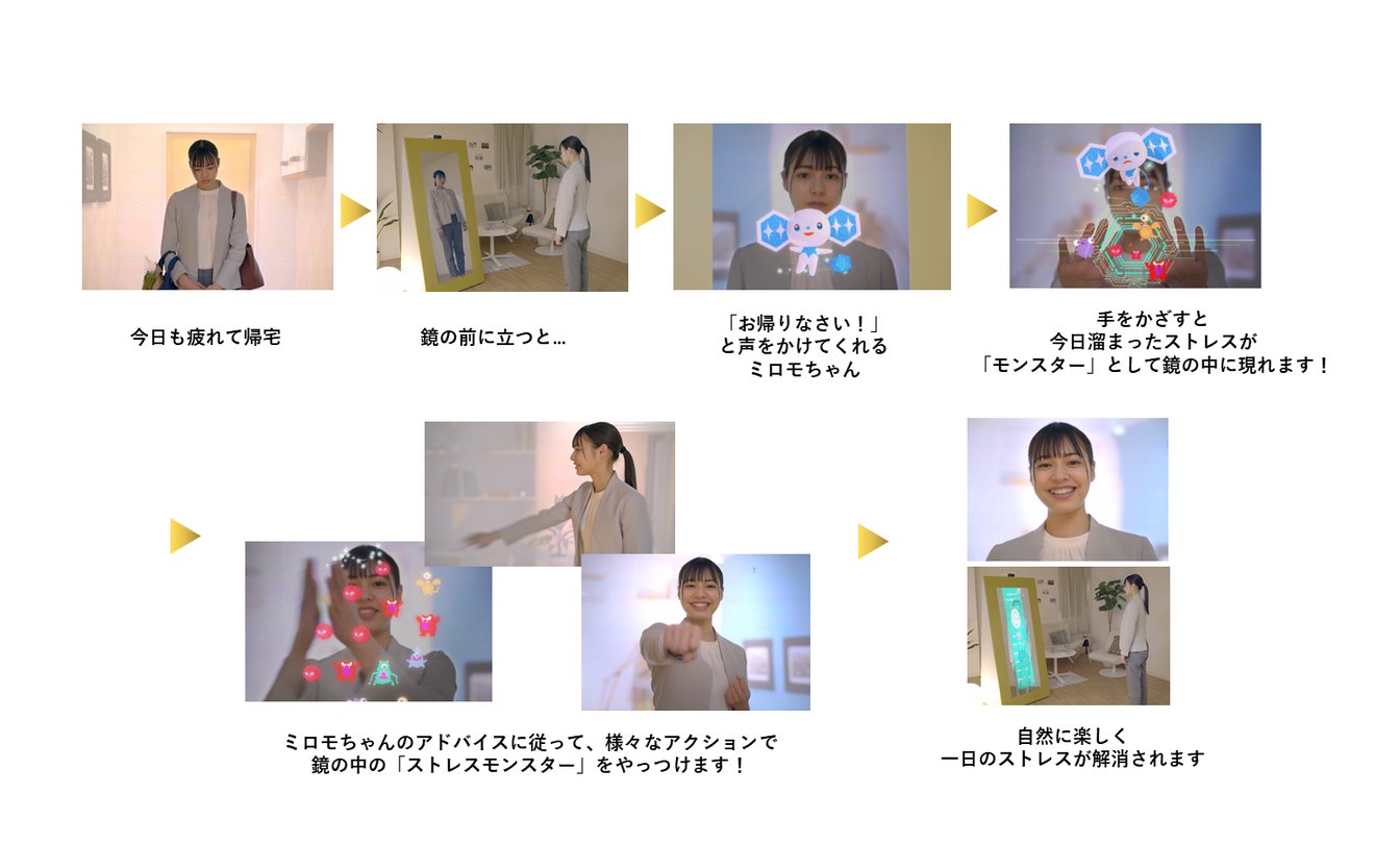 この呼びかけに応えて鏡に手をかざすと、仕事や日々の暮らしの中で気づかない間に溜まったストレスが「ストレスモンスター」として見える化されるというのです。
