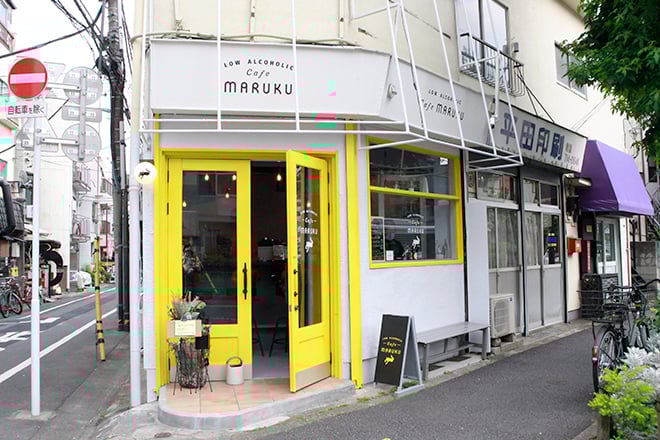 2021年5月、東急東横線学芸大学駅近く、目黒区鷹番に「LOW ALCOHOLIC CAFE MARUKU(ロー アルコホリック カフェ マルク)」がオープンした。黄色い扉に猫のイラストが印象的なエントランスからはふつうのカフェを想像するが、実はアルコール度数1%未満のビールやスパークリングドリンク、ワインを30種類も揃える専門的なノンアルコールバーだ。コロナ下で飲食店での酒類提供に規制がかかる中、「モクテル」と呼ばれるノンアルコールのカクテルを扱うバーやカフェが増えてきたが、瓶や缶からそのまま飲めるレディ・トゥ・ドリンクのノンアルコールをこれだけ揃える店は国内でもまだ珍しい。