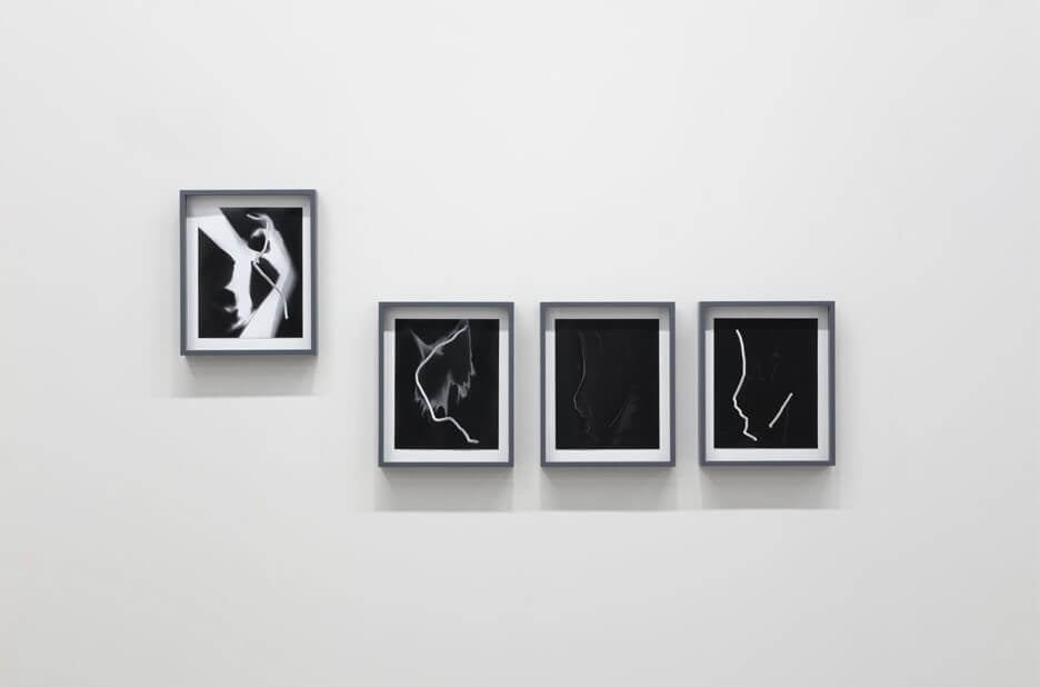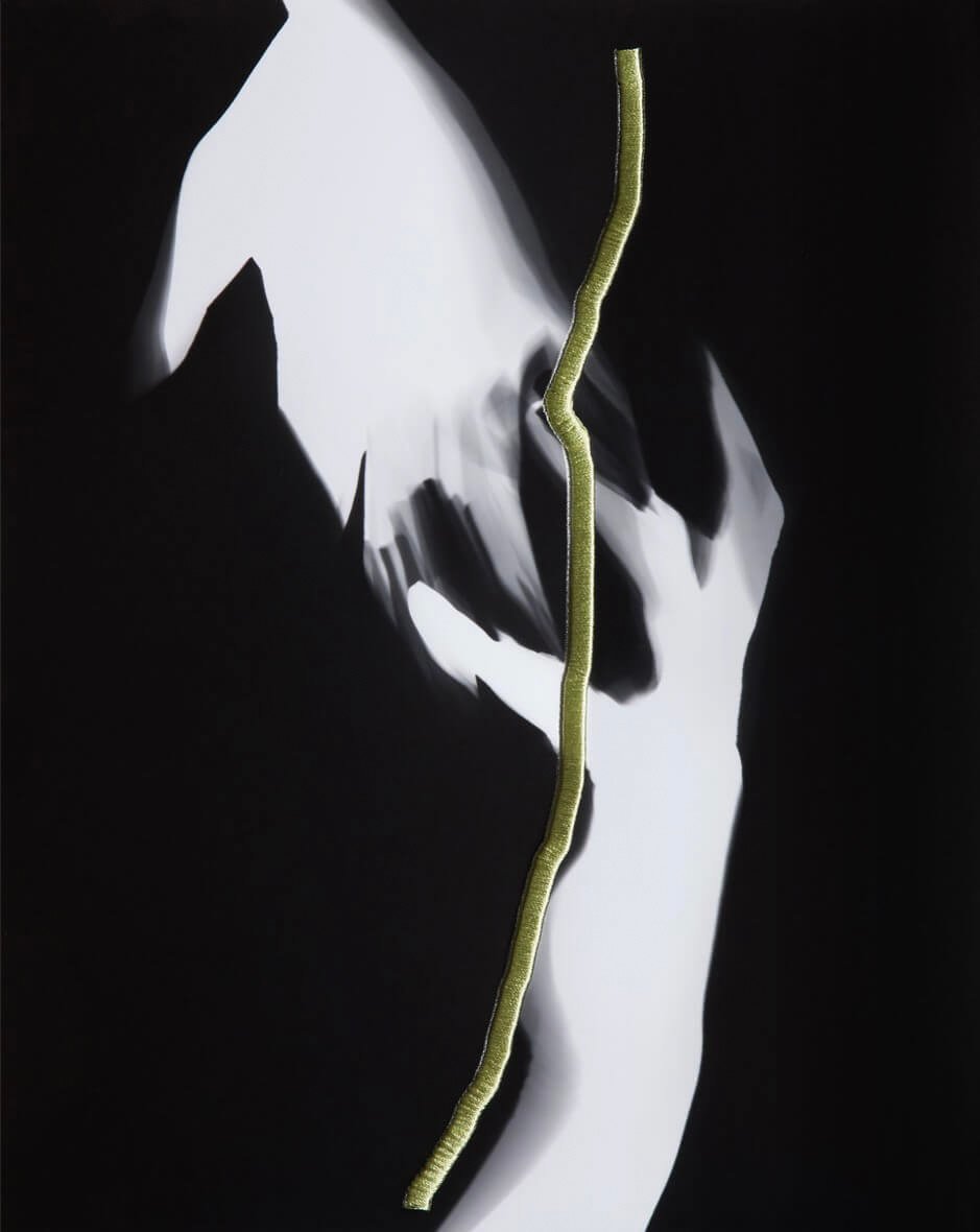 新作「Sen to Te」は、「カメラを使わない写真」と言われる技法であるフォトグラムのプリントに刺繍を施した作品であり、近年の細倉が行ってきたデジタルによる制作プロセスが、アナログで物理的な空間へと移行。