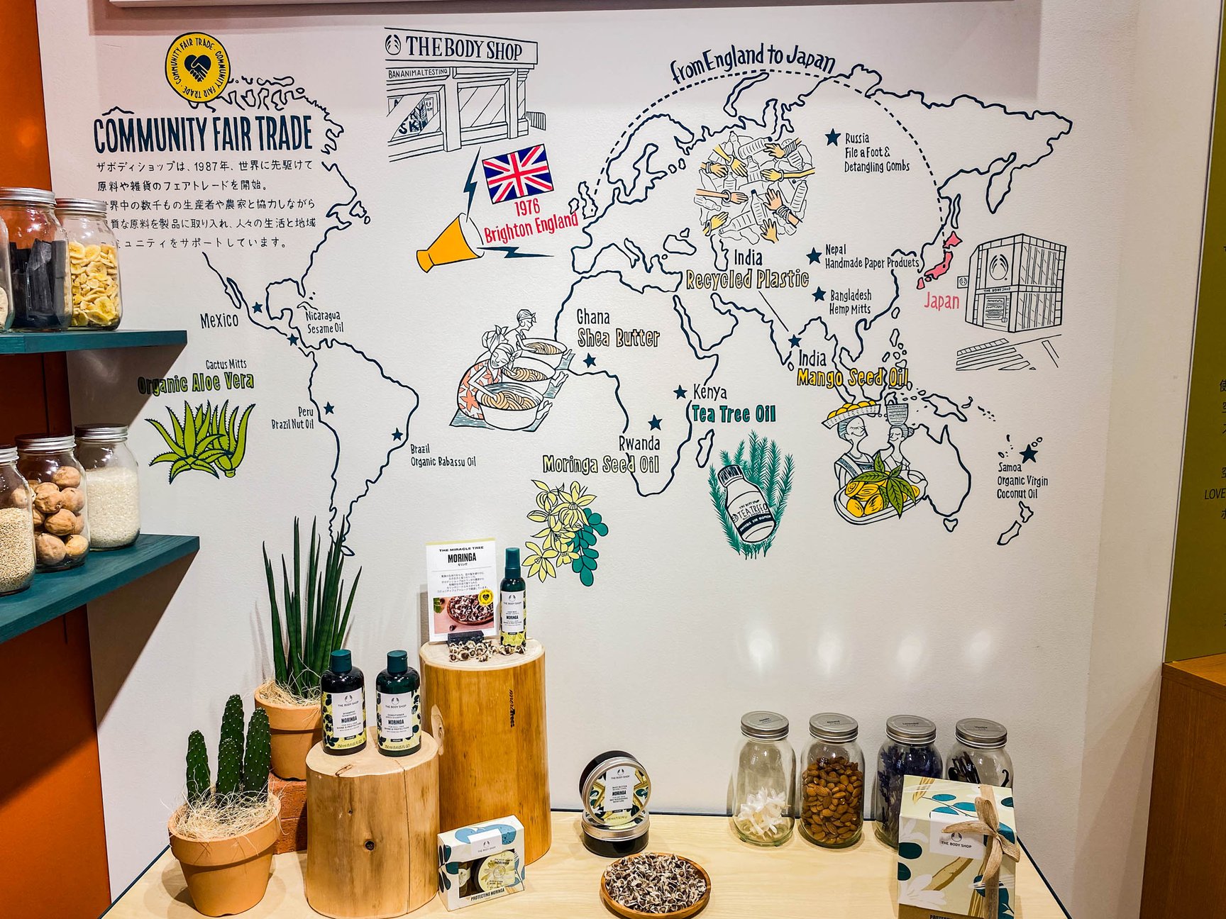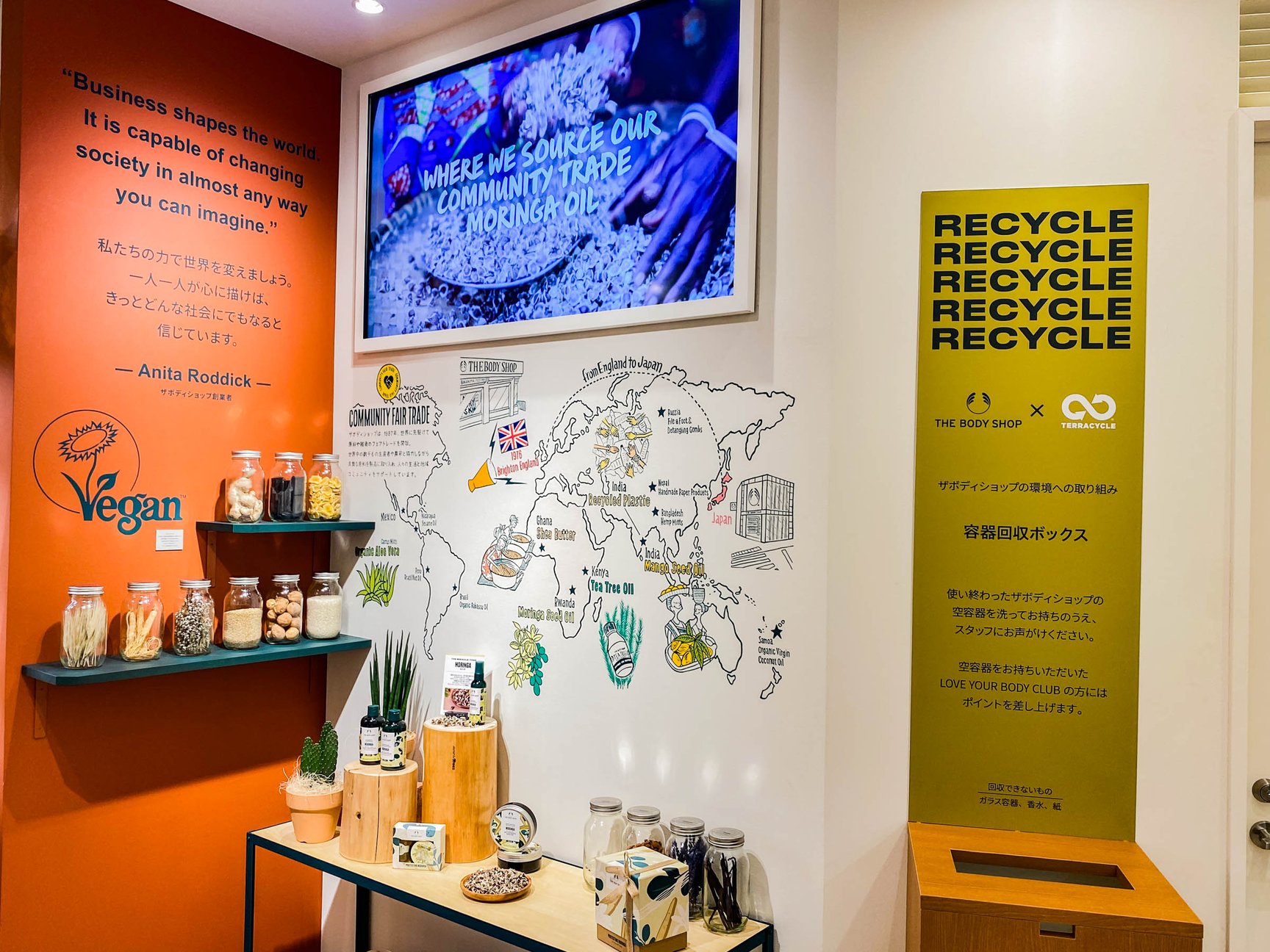 さらに、東武池袋店のオープンと同時に、テラサイクルジャパンと共同で使用済み容器の回収プログラム「RETURN. RECYCLE. REPEAT.」を始動。プラスチック・アルミ製の空容器を回収し、消費者の参加によってリサイクルの輪を広げる考えだ。容器回収プログラムは今後、表参道店、新宿店、渋谷店でも順次導入する。このほか、店内に「ブランドストーリーハブ」と称したエリアを設け、ブランドが取り組んできたコミュニティフェアトレードのストーリーをより分かりやすく発信している。「初めはサステナビリティの視点で選ぶわけではなくても、購入した商品がエシカルなサイクルで生産されていて結果的に環境負荷の削減に参加していることになる。当店の商品や取り組みを通じて、環境について考えるきっかけとなればと思う」と杉山ストアマネージャー。