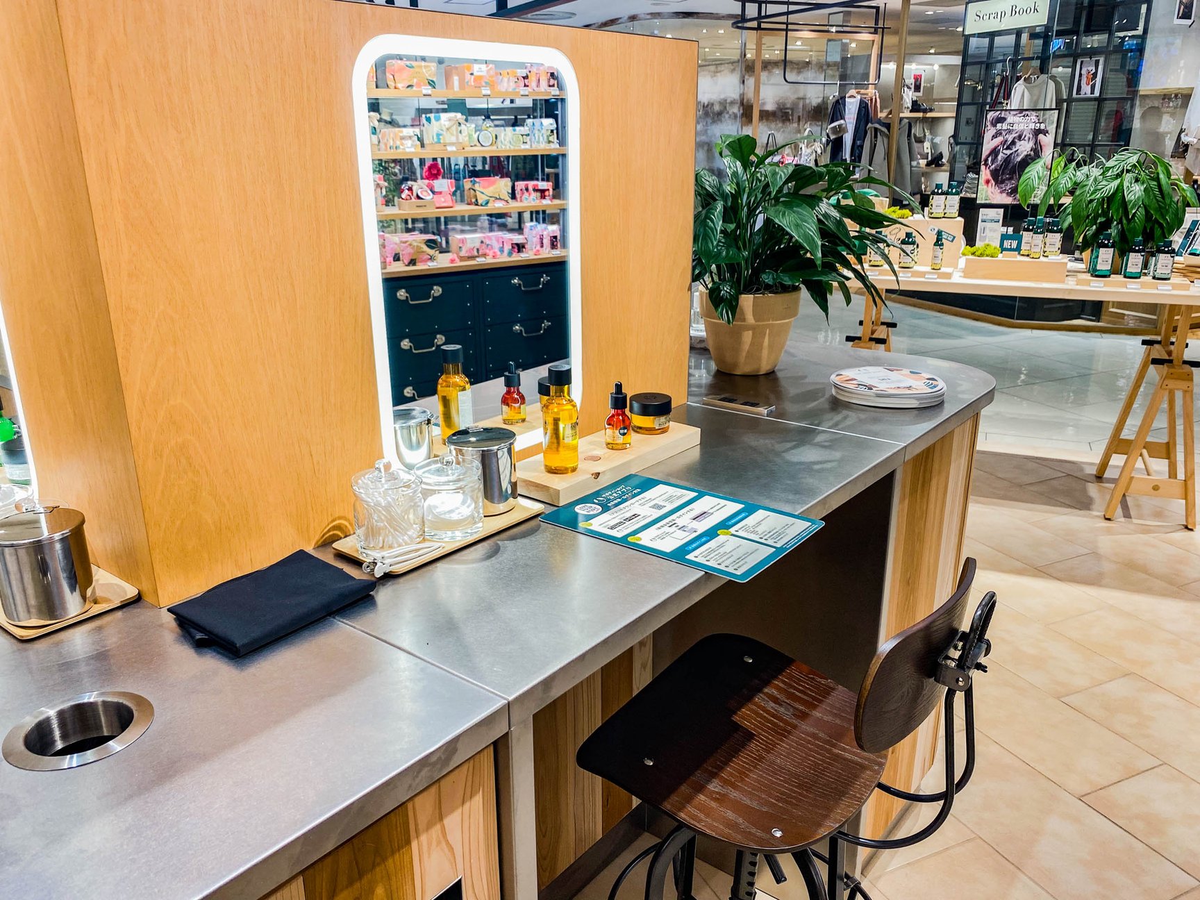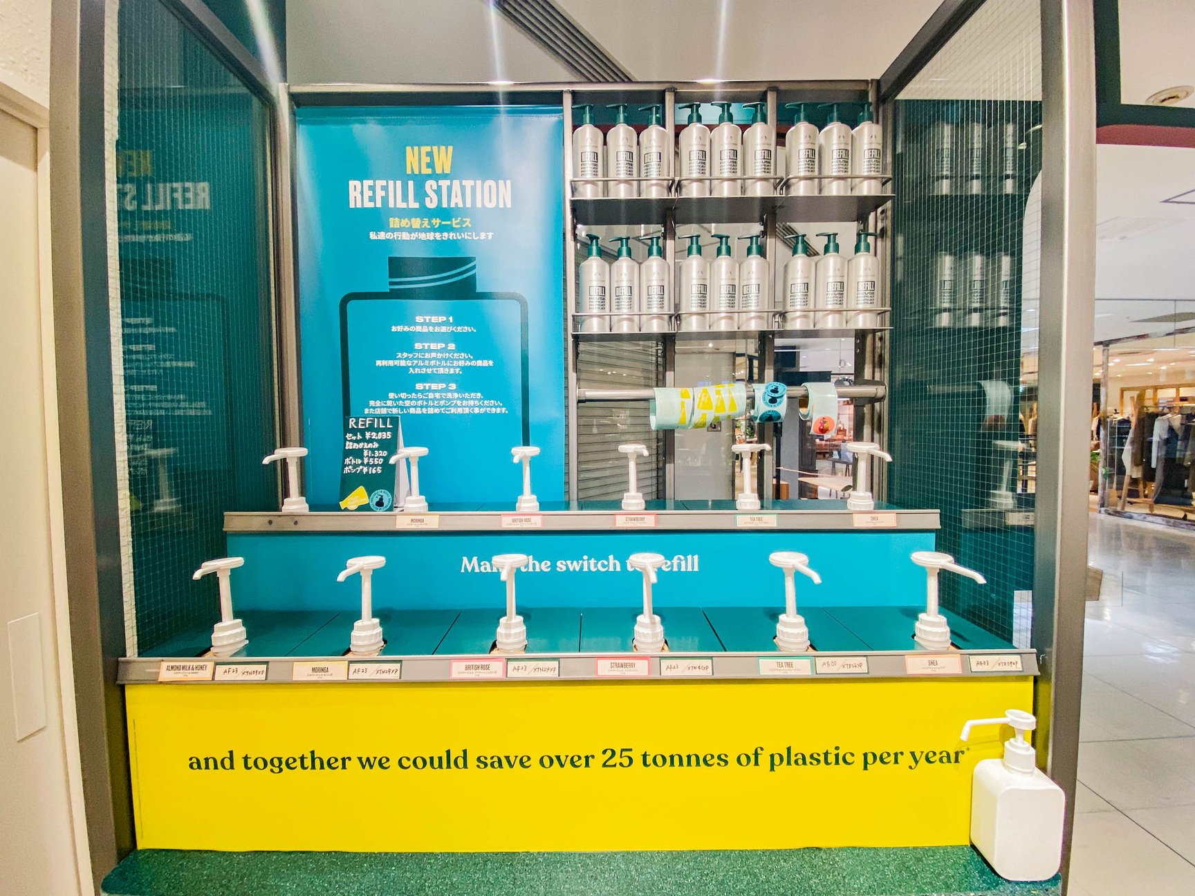 プラスチック削減のための詰め替えサービス「リフィルステーション」も併設。専用のアルミボトル(300g)とポンプを購入(中身とのセット価格2255円)し、中身を充填してボトルを再利用することができる。人気のボディシャンプー4種類のほか、リフィル限定商品のハンドソープ2種類をラインナップ。2回目以降はリフィルボトルとポンプを持参し、詰め替えることができる(1540円)。東武池袋店のストアマネージャー杉山弥生によると、「リフィルサービスについて説明すると、価格が少し高くても積極的にリフィルステーションを選ぶ顧客が多く、エシカル消費に関心の高いユーザーが多い印象」で、オープン後間もないが良い反響を得ているという。なお、ブランドでは創業当時にリフィルサービスを展開し、日本では一時休止していたが、よりサステナブルで再生可能なビジネスの実現に向けて、アクティビストワークショップの出店を機に再開した背景がある。
