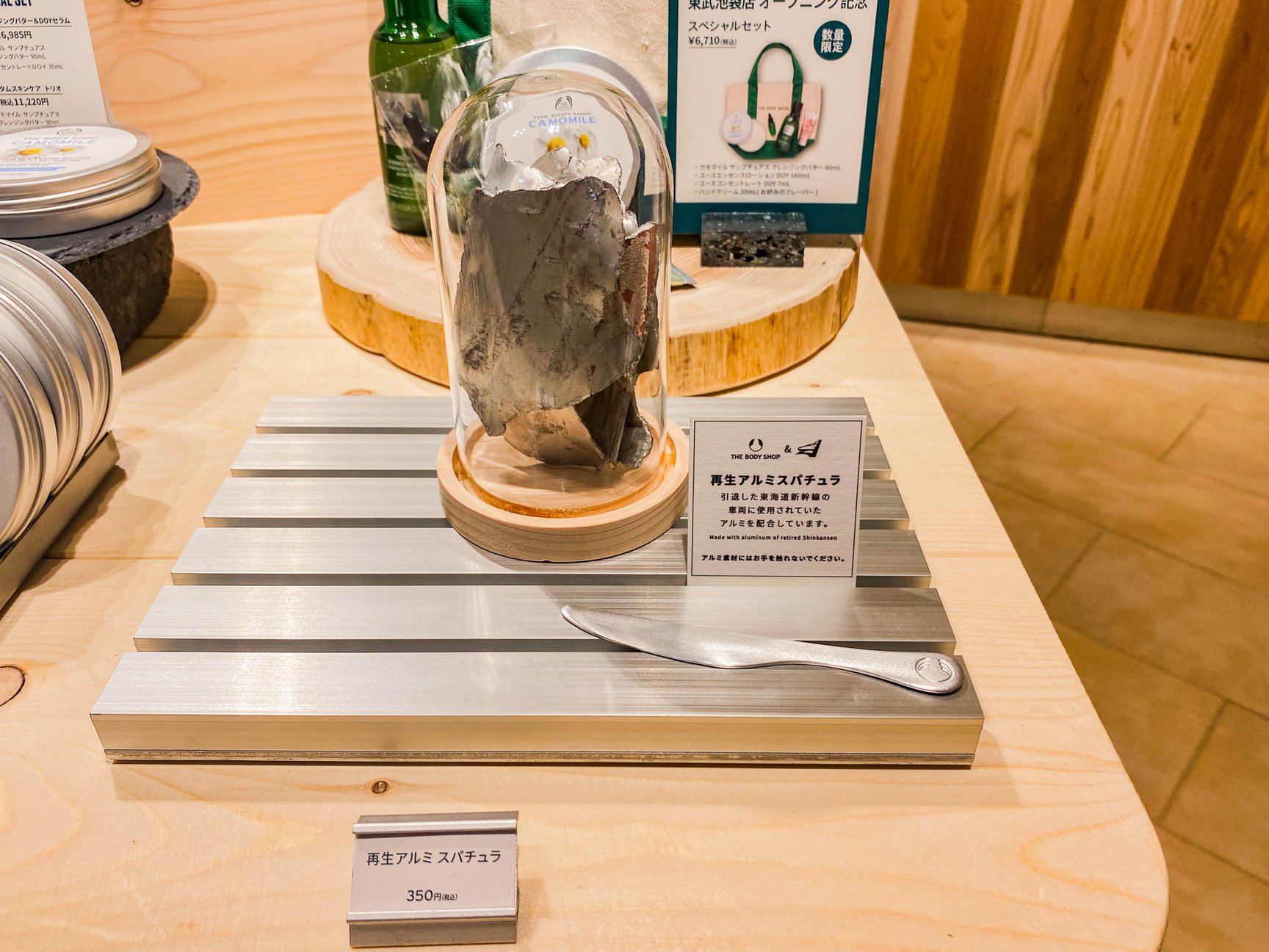 アクティビストワークショップの日本独自の取り組みとして、東海旅客鉄道(JR東海)と協業して、引退した東海道新幹線の車両アルミをリサイクルし、店内の什器などで活用。リサイクルアルミを用いたスパチュラも販売している。床材は美濃焼の製法を取り入れ、環境負荷が少ないグリーン購入法適合素材ミノアールを選び、随所に散りばめた木材および間伐材はFSC認証を取得したものを採用した。