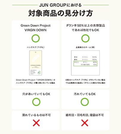 回収対象商品は、ダウンジャケットなど衣類製品のみで、ダウン(羽毛)率50%以上のものが対象。Green Down Project「VIRGIN DOWN」のハングタグが購入時に付いている商品が該当となる。