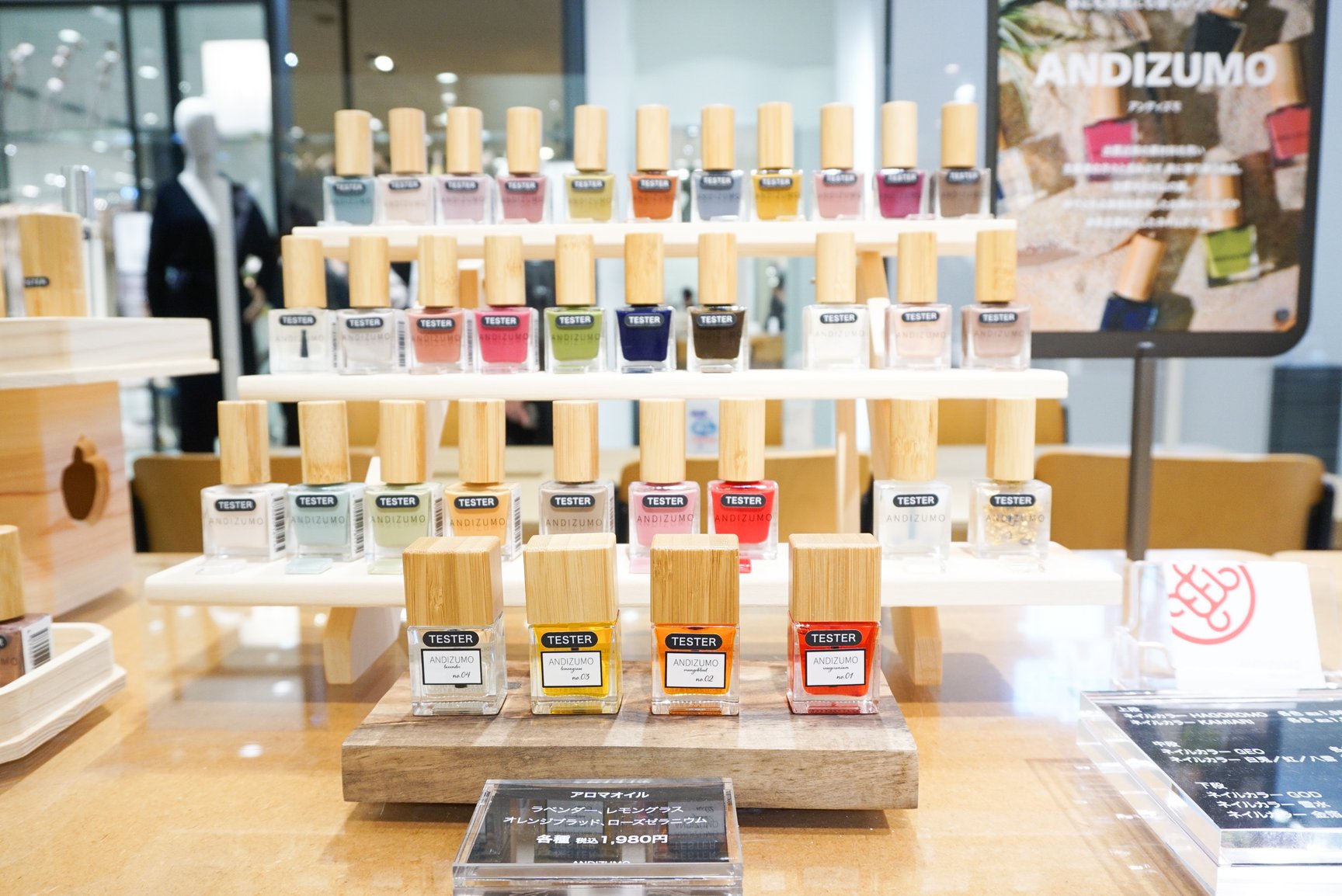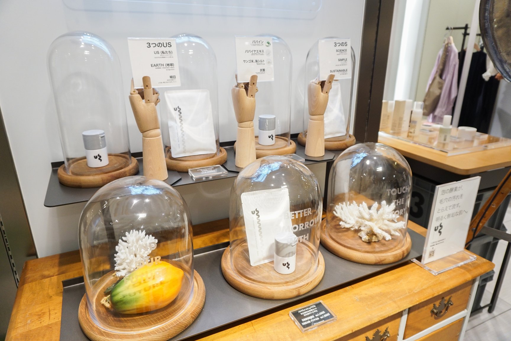 明日見世のスペースは4階フロアのイベントスペースに配置。売場面積は約100平方メートルで、什器や装飾物にはリサイクルできる素材やユーズド家具を組み合わせた。4階フロアは「エンポリオ アルマーニ(EMPORIO ARMANI)」や「エポカ(EPOCA)」「ベイジ,(BEIGE)」といったエレガントなウィメンズブランドのほか、「ユナイテッドアローズ(UNITED ARROWS)」ウィメンズストアや「トゥモローランド(TOMORROWLAND)」といったセレクトショップが並ぶ。イベントスペースではウィメンズのファッションブランドのポップアップを開催することが多かったが、明日見世はテーマに合わせてファッションからコスメ、生活雑貨まで幅広いラインナップを展開する。