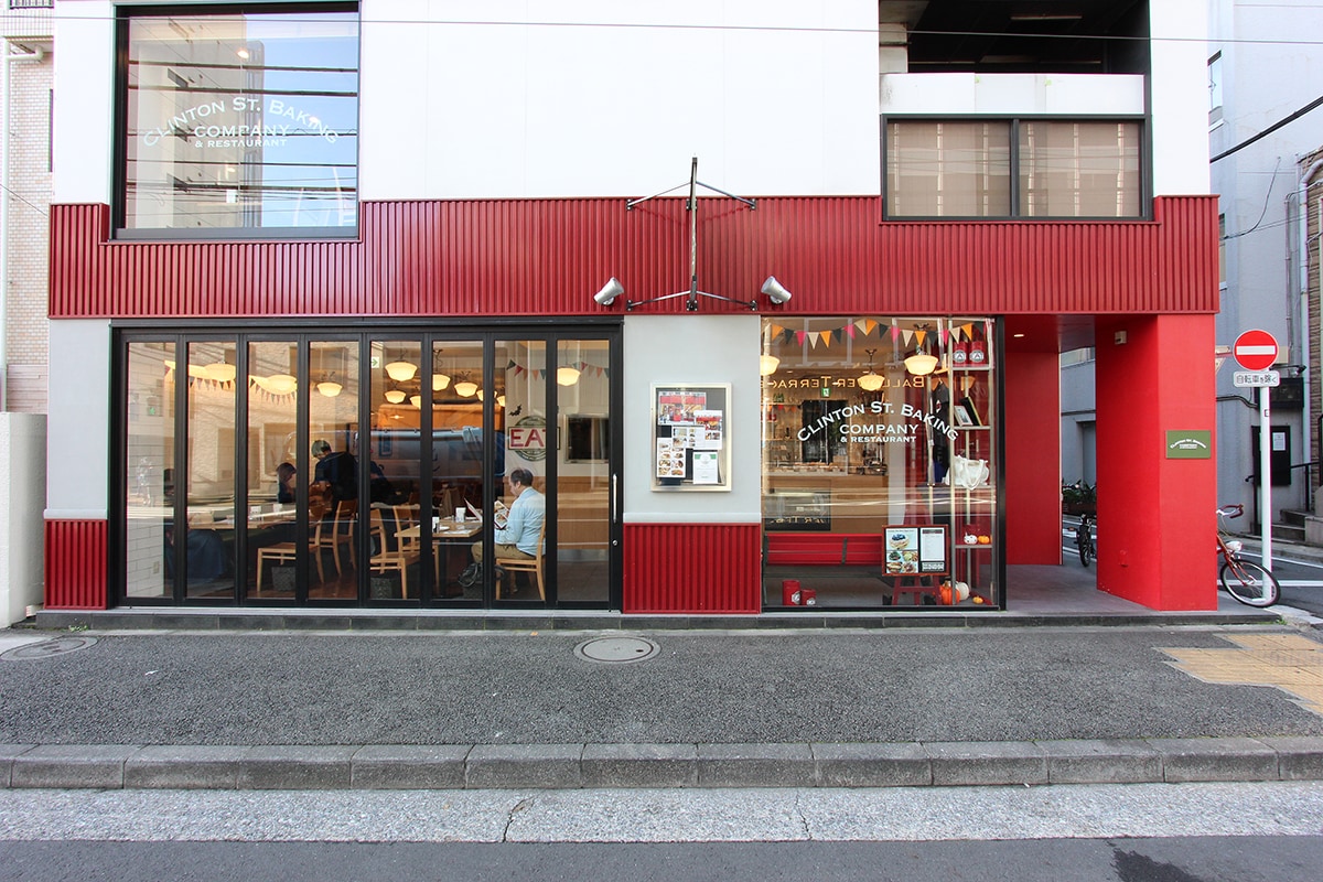 骨董通り沿いにある真っ赤な塗装の外壁に緑の旗が目印の「Clinton Street Baking Company Tokyo」。