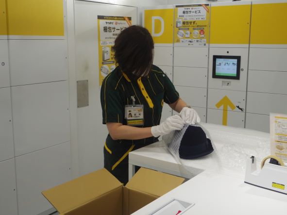 プドーステーションで受け付けた未梱包の商品は、最寄の宅急便センターが専用ボックス(商品を保護する内部仕様となっている)で回収し、センターで梱包(クロネコスタンド豊洲4丁目センターはバックヤードに控える担当者が梱包)。宅急便センターでは、対面で商品を引き取り梱包して発送する。