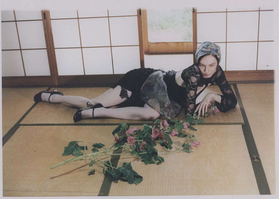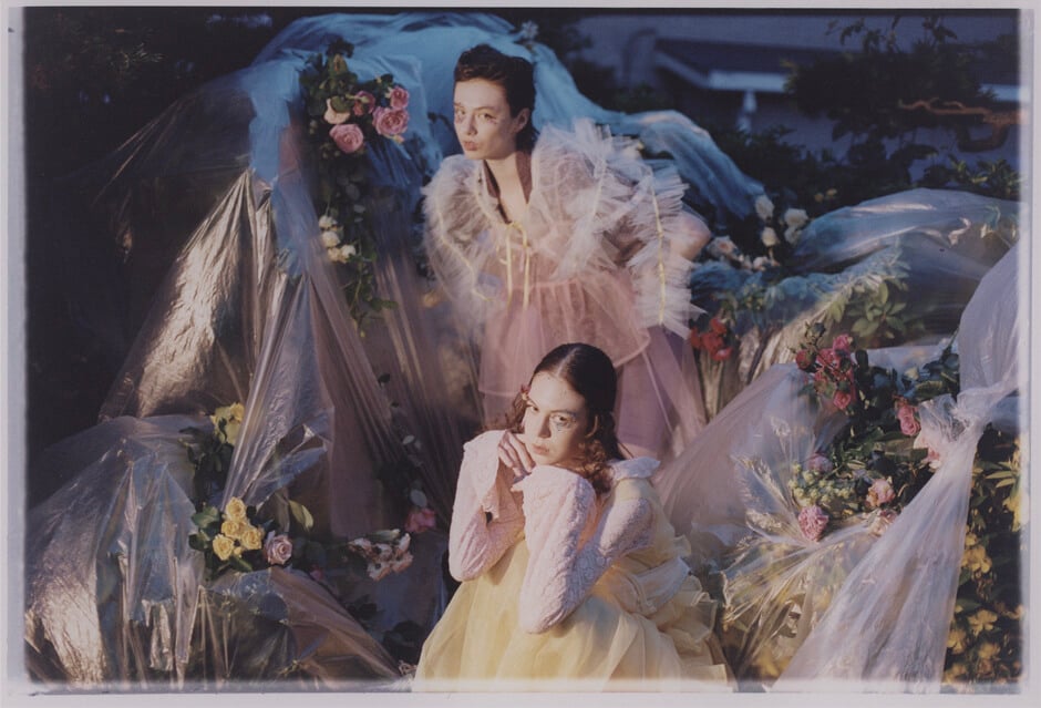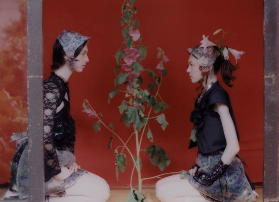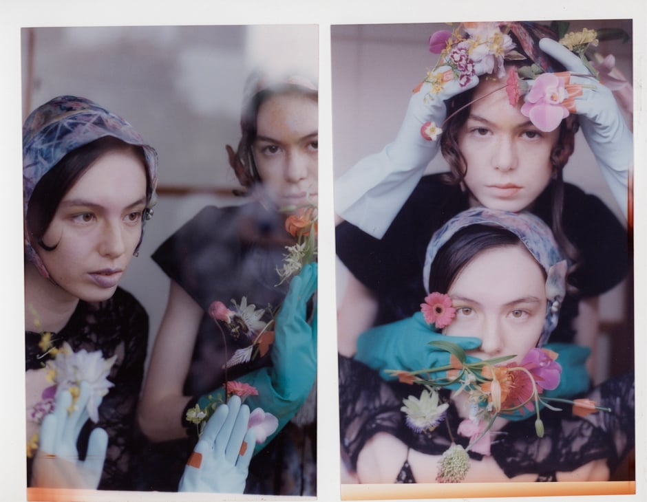 left - top by BELLMINON, shoes by MIU MIU, headdress by ANONHAT, cardigan stylist’s own, right - cardigan by BELLMINON, headdress by ANONHAT, top and shoes stylist’s own