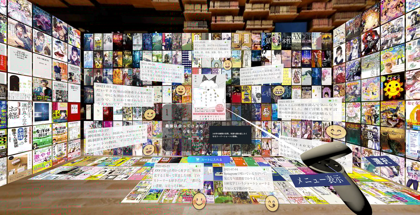今回開催されるイベントは、体験者が店頭に設置されたVRゴーグルを装着することで「本棚劇場」のVR空間に入れるというもの。そこは、360°すべて本の表紙で埋め尽くされた空間だといいます。体験者は、イベント限定の約2,000点のラインナップの中からカーソルで選んだ本の情報やレビューをワンクリックで閲覧でき、そのまま購入することも可能。購入した本は送料無料で自宅に届くとのことです。両社はこの取り組みを通じ、出版業界における廃棄物の削減などを目指すといいます。