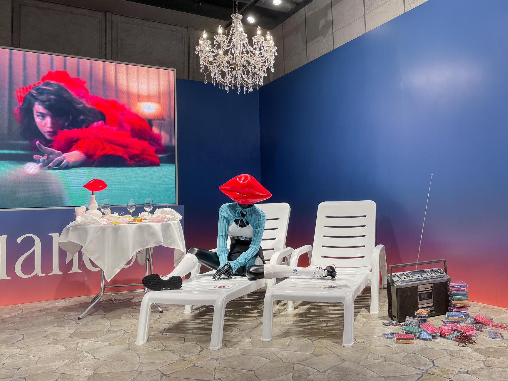 1階の一部にはスタイリストの山田陵太による「スポーティに着崩したテーラードスタイル」を提案するスタイリングを展示。2階のスイートルームは仙波レナが「パーティから帰ってきて過ごすホテルの部屋での余韻」を、3階のプールは二宮ちえが「プールサイドのランジェリールック」をテーマにそれぞれ装飾やアレンジしたディスプレイを用意している。各フロアでは、スタイリングで使用したアイテムをはじめ、テーマに合ったアイテムなどを販売している。