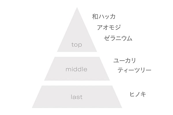 ラストは、落ち着いた温かみのあるヒノキの香りが長く続いて、まるで森林浴をしているような、深いリラックスへと導いてくれるそうですよ。