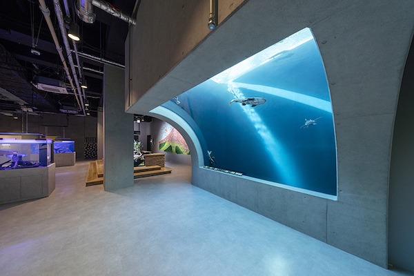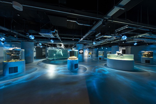 各ゾーンにはゾーンテーマを象徴したシンボル水槽のほか約60基もの水槽が設置。