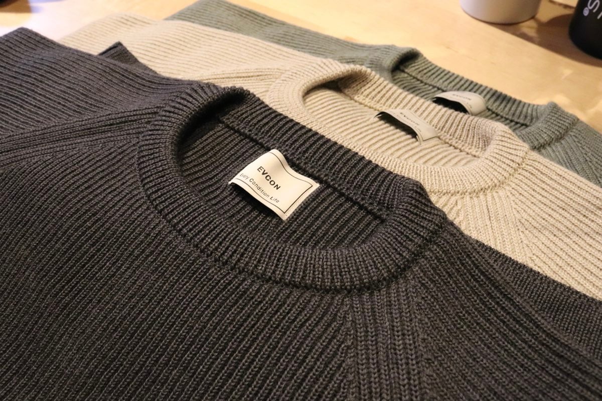 今期のイチオシを木下さんに紹介してもらった。「毎シーズン人気な『EVCON(エヴィコン)』のシェットランドクルーネックセーター(20,900円)がおすすめです。今期はそれぞれ新色となるチャコール、ベージュ、カーキで展開されていて、1枚でざっくり着ても、インナーにシャツに合わせてもいいですね。ネックはしっかりしていてヘタりにくく、その上、詰まりすぎていない程よい作りになっています。アームと身幅は大きくて着丈は短め。スウェットに近い感覚でラフに着られます。シンプルに使える万能セーターです。」