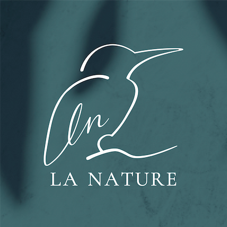 ロゴには、翡翠(カワセミ)を起用。カワセミは美しいコバルトブルーの⽻を持ち、別名”清流の宝⽯”とも呼ばれている。綺麗な川辺にしか生息しない幸運を運ぶ鳥カワセミとLA NATUREのコンセプトである”自然”をかけ合わせ、高級感のあるモダンなロゴが完成した。