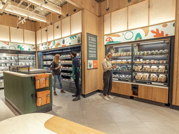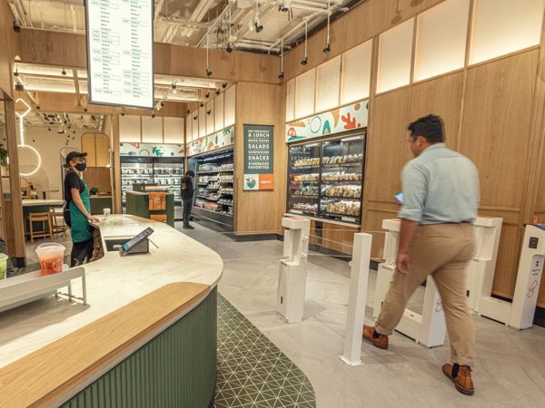 そして店舗の奥の棚には、サンドイッチやサラダなどの軽食を中心とするAmazon Goの商品が並んでいます。このエリアに入る際には入り口近くに設置されているターミナルにAmazon Oneで登録済みの手のひら、あるいはクレジットカードをかざすようになっています。この「Just Walk Out」テクノロジーにより、客は棚から取った商品をレジで精算することなく購入できるようになっています。