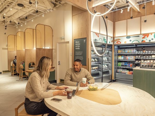 店舗にはテーブルや椅子を備えたラウンジエリアもあります。Starbucksで受け取ったコーヒーとAmazon Goで選んだサンドイッチなどを食べることができ、いずれもキャッシュレスの体験となります。