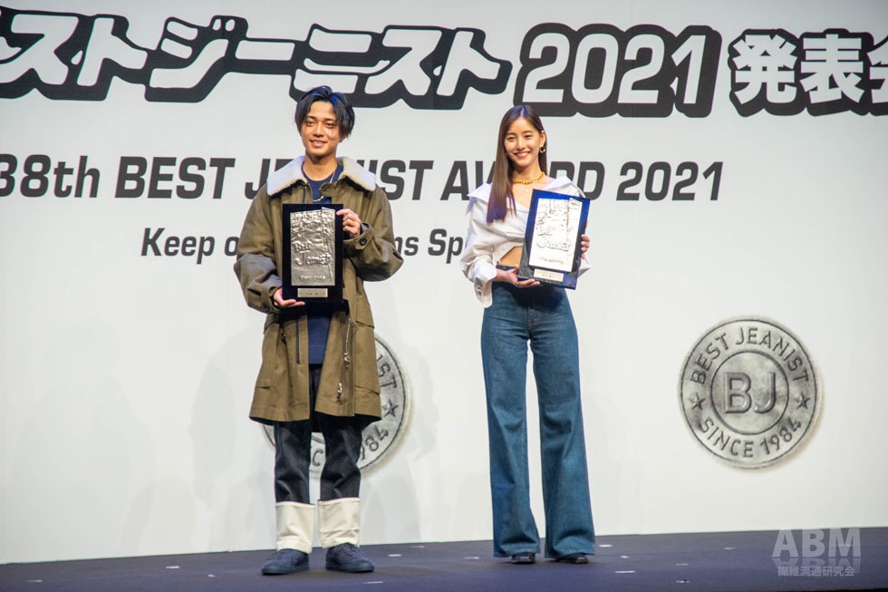 永瀬さんは「デビュー前から欲しいと思っていたから嬉しい。ジャニーズのそうそうたるメンバーも受賞してきたものなので、僕でいいのか?と思ったけれど、この賞にふさわしい人になりたいです」とコメント。新木さんは「デニムが好きなので憧れていました。一般の方から選んでいただけて嬉しいです」と話した。