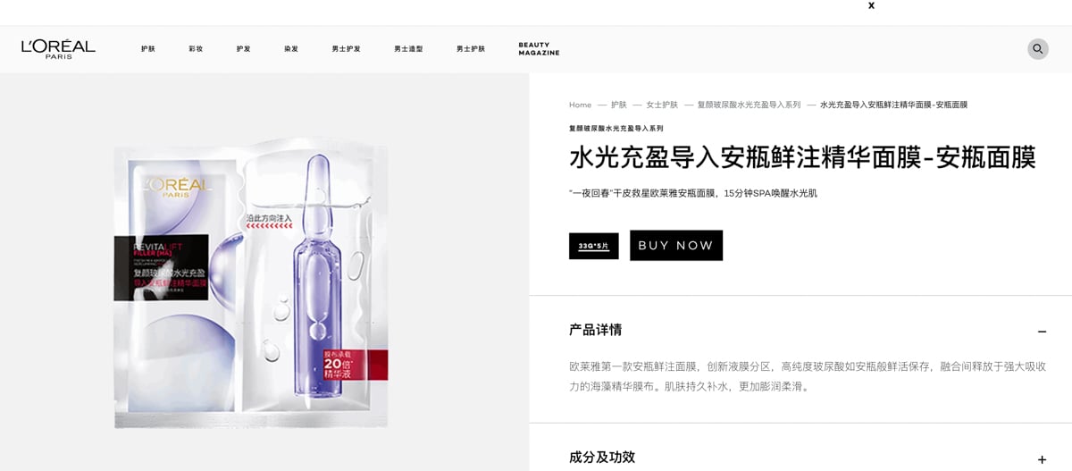 ロレアル パリ「アンプルフェイスパック」/中国のロレアル パリ公式サイトより