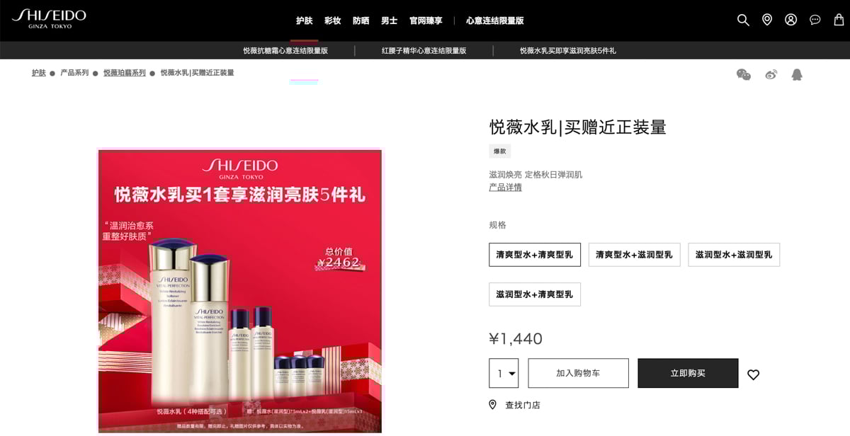 「SHISEIDO バイタルパーフェクション」のセット/中国のSHISEIDO公式サイトより
