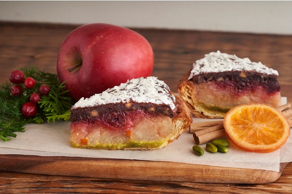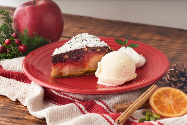 『ブラウニーとチェリーのクリスマスアップルパイ』は、しっとりと焼き上げたチョコブラウニーに、スパイスの香りが広がるりんご、甘酸っぱいチェリージャムにピスタチオのナッティーなコクが重なり、奥行きと重厚感ある味わいに。コーヒーやカフェラテ、紅茶はもちろん、シャンパーニュやワインに合わせるのもおすすめだ。