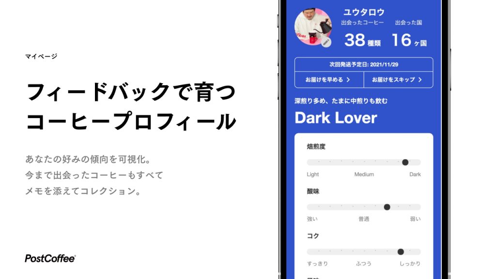 最後に注目したいのは、マイコーヒープロフィール。PostCoffeeを通して飲んだコーヒーのフィードバックを残せたり、好みもチャート式で表示できたりと、自分のコーヒープロフィールを作成することが可能です。