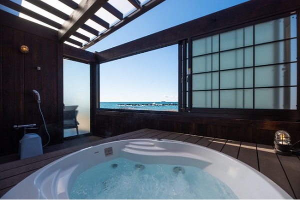 露天風呂は個室のようなジャグジー。海を眺めながら、まったりとした時間を過ごせる。