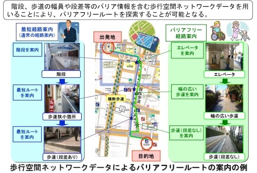 段差や幅員などのバリアフリーに関連する情報を付与した「リンク」およびリンクの結節点を表す「ノード」で構成したこのデータを用い、バリアフリーマップの作成やバリアフリールートのナビなど、ICTを活用した歩行者移動支援サービス普及に取り組んでいます。このICTを活用した歩行者移動支援サービスの普及に取り組んでいるのが、「バリアフリー・ナビプロジェクト」です。