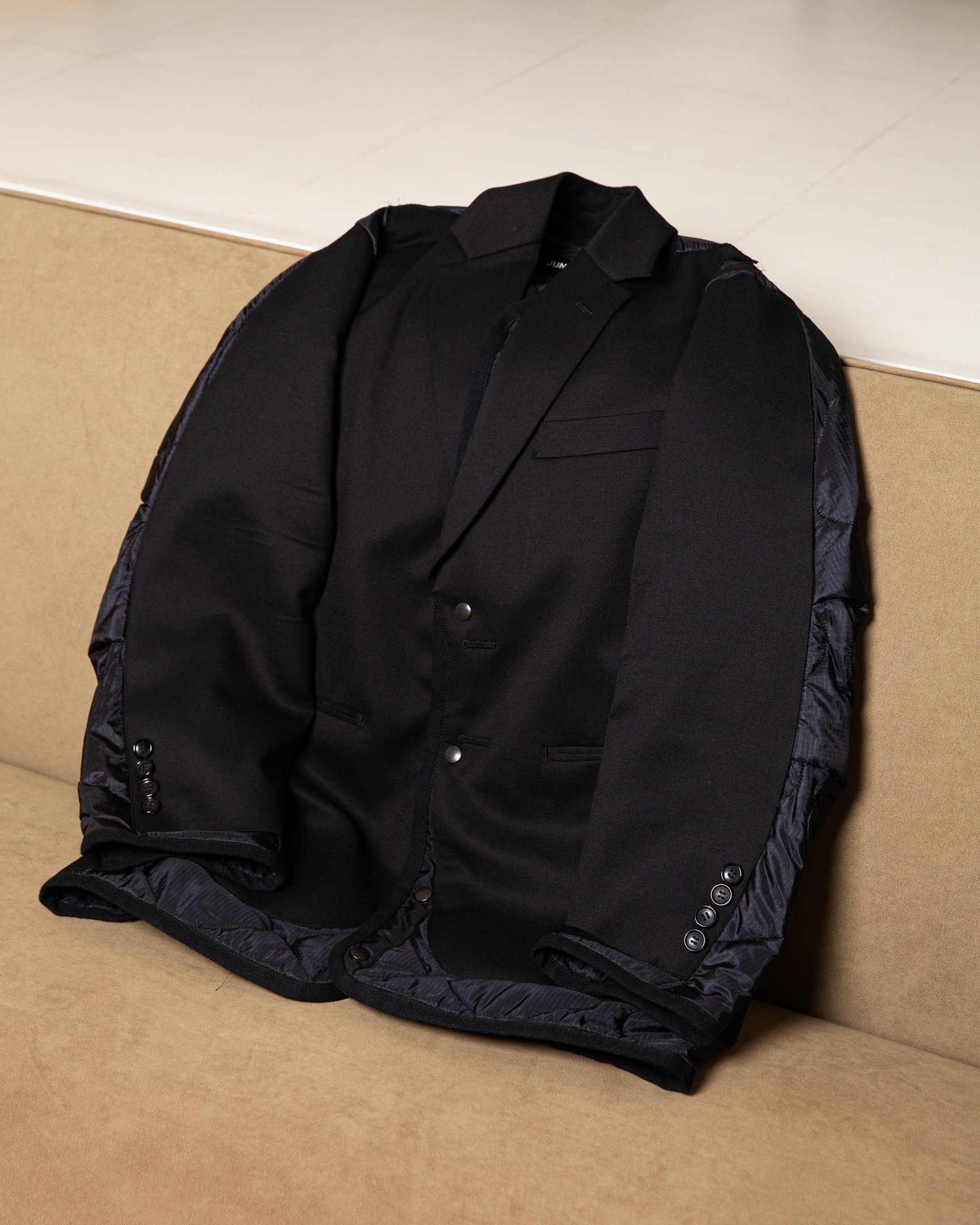 F:テーラードジャケットを解体してレイヤード風にドッキング......かなり作りが凝っています。