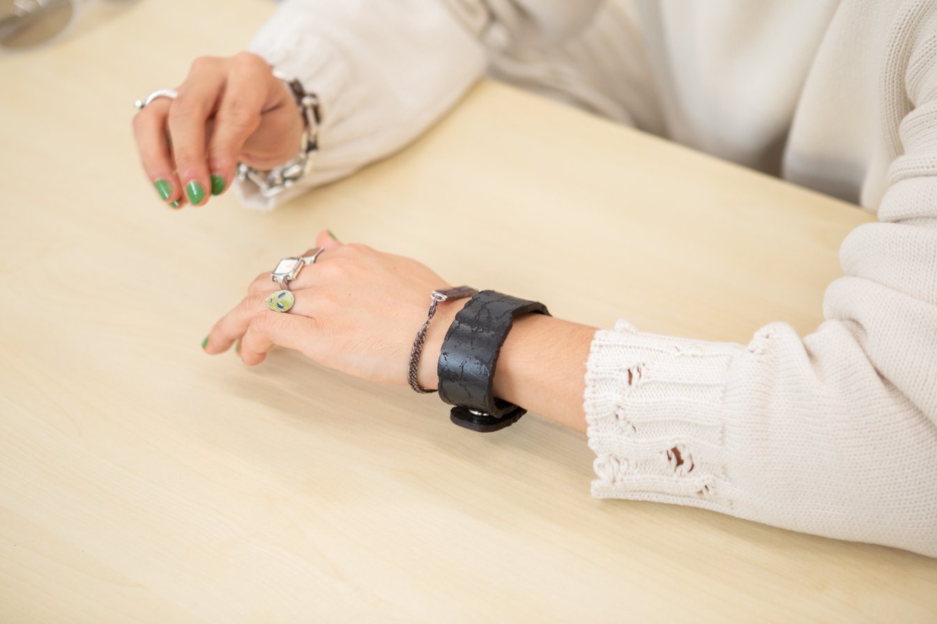 レイジ:Hoshi Eisukeさんという方が作ったレザーバングルです。基本的にはグラフィックデザイナーの仕事をしている人で。バンド「夜の本気ダンス」のバンドロゴもこの人が制作しています。